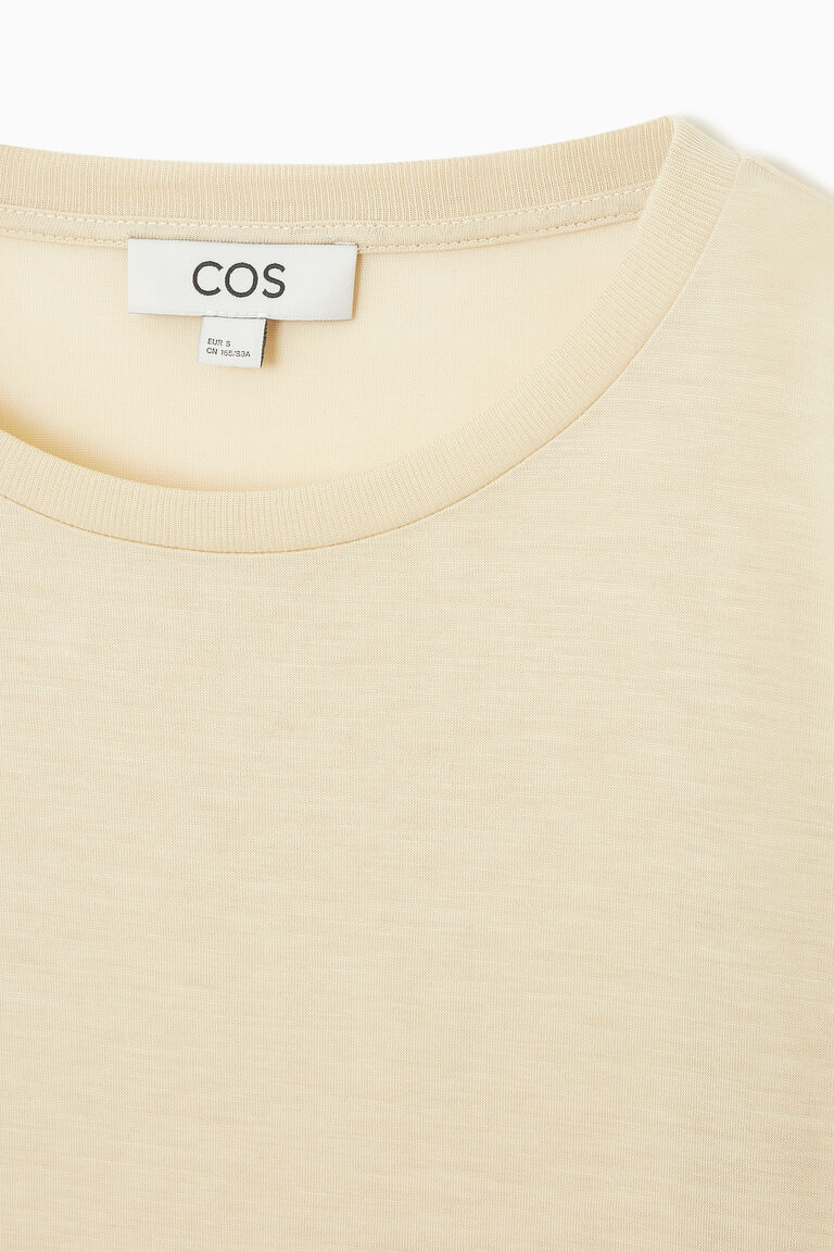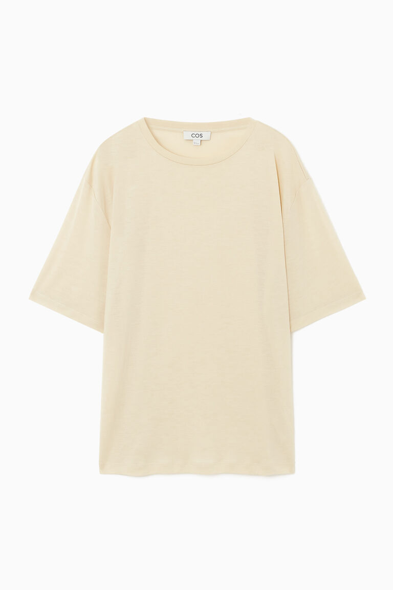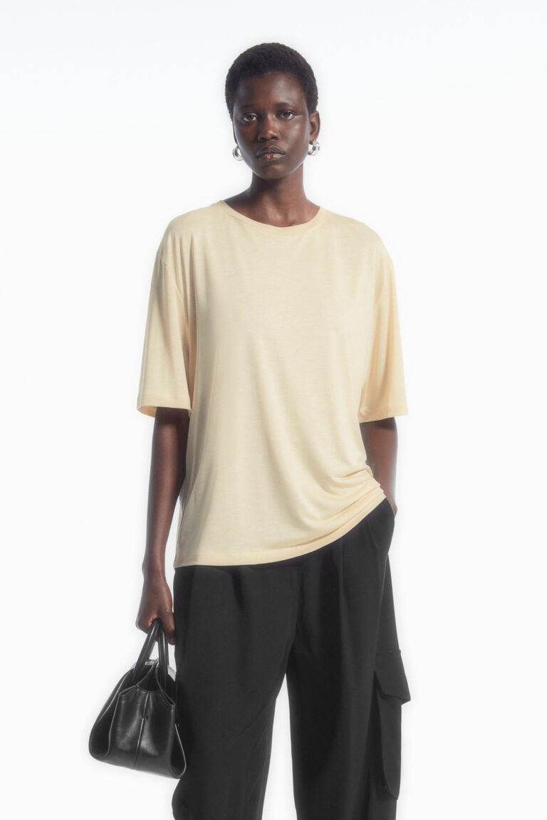This T-shirt evokes a nonchalant ease, owing to the laid-back silhouette and floaty TENCEL™ Lyocell jersey, which was chosen for its super soft hand feel and fluid drape. It's designed with dropped shoulders and elbow-length sleeves that enhance the relaxed shape and offered in a dusty-white hue that will complement everything you style it with.