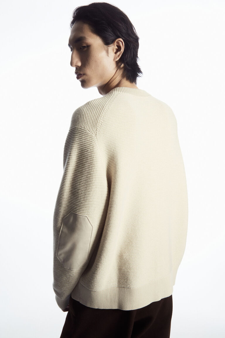 The classic Henley top is reimagined for Autumn Winter 2023. Offered in a versatile cream hue, this jumper is waffle-knitted from a cotton blend with hints of wool and cashmere, and has the signature half-placket that can be worn buttoned up or loose to show a T-shirt layered underneath. It's designed with a contrasting chest pocket and patches at either elbow.
