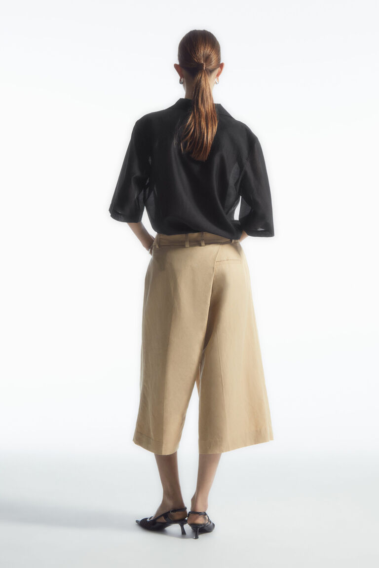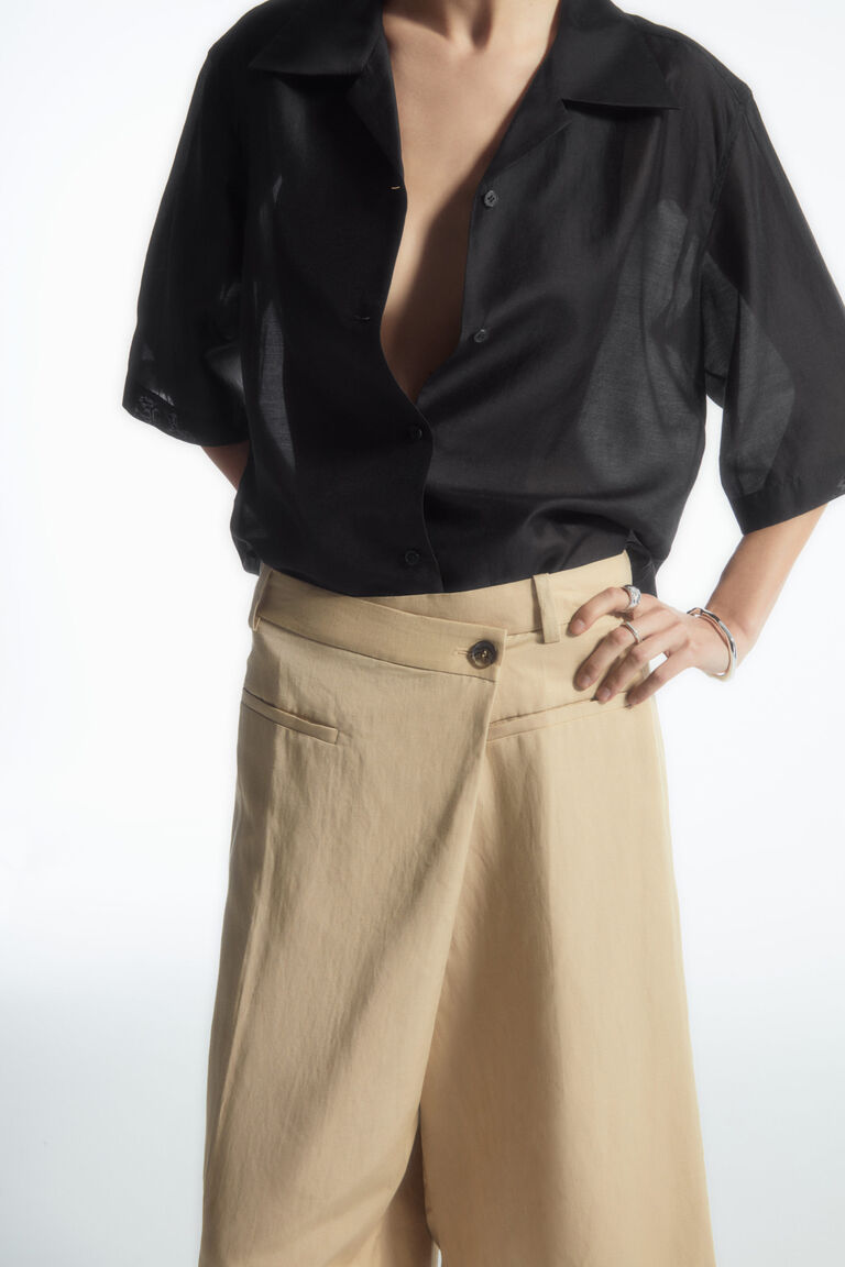Looking to striking architectural lines, the COS womenswear team reimagine the classic culottes, incorporating an asymmetric wrap design to the waistband. The clean finish and enduring black hue lend them to easy styling, while the cropped length is suited to the warmer months.