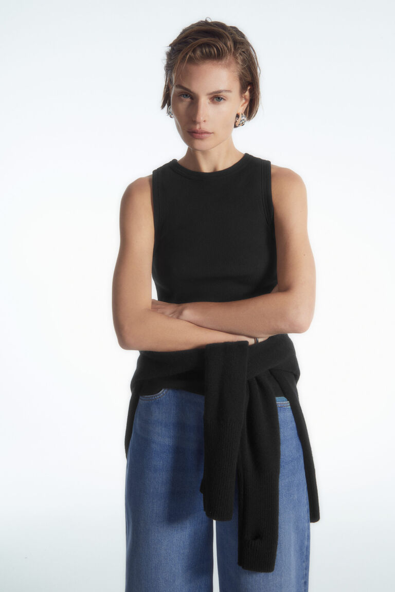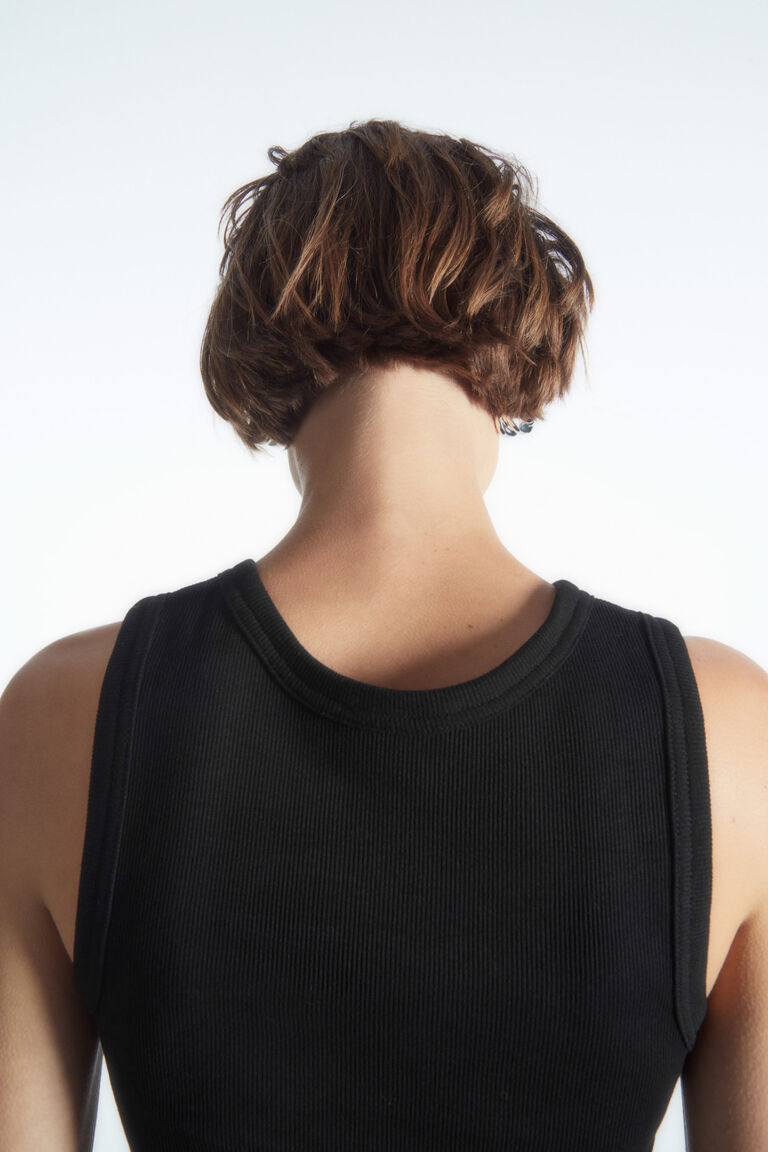 Anchor your everyday wardrobe with premium essentials like this tank top. Offered in versatile black, it's crafted from ribbed organic cotton-blend jersey and designed with a classic crew neck and a subtle racerback silhouette.