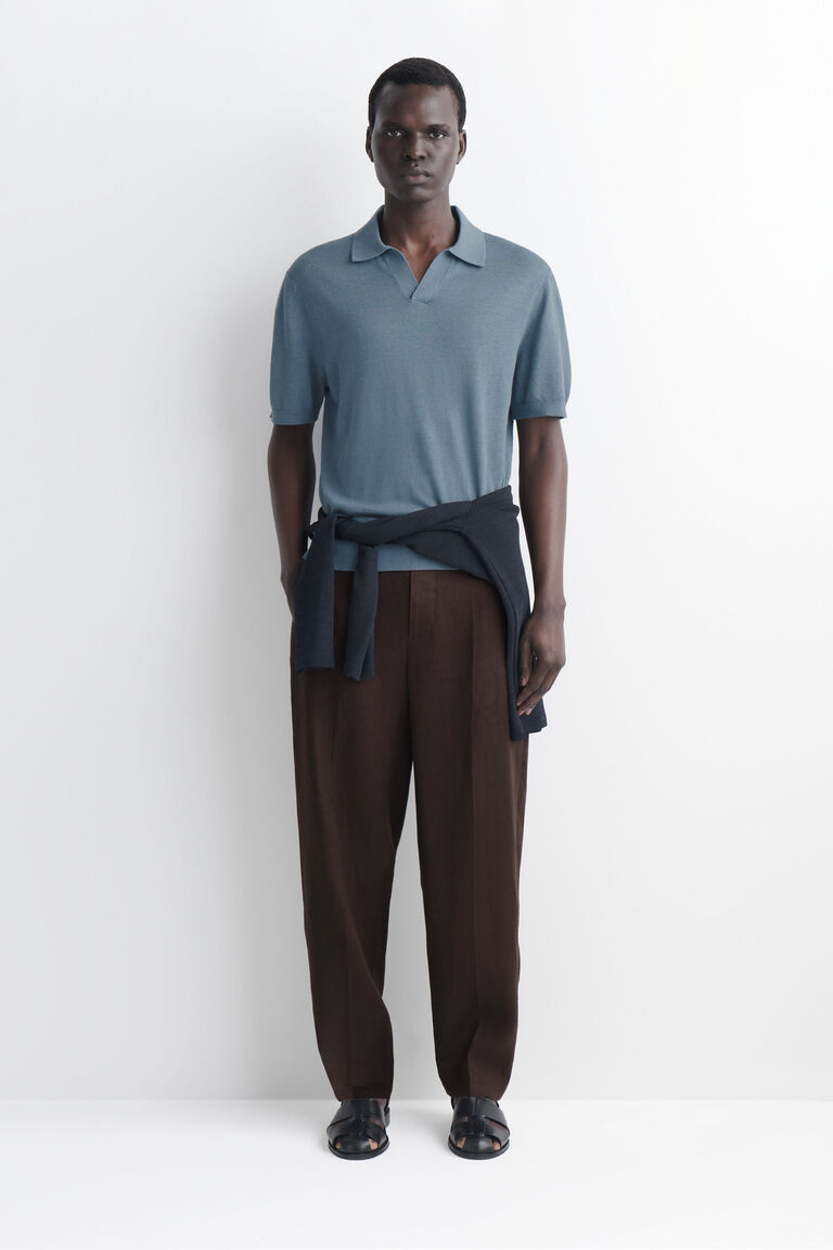 This season, the classic polo shirt is rendered in a naturally breathable linen and cotton blend that's knitted to create a subtle mélange effect. It's cut in a relaxed shape and designed with a laid-back open collar.