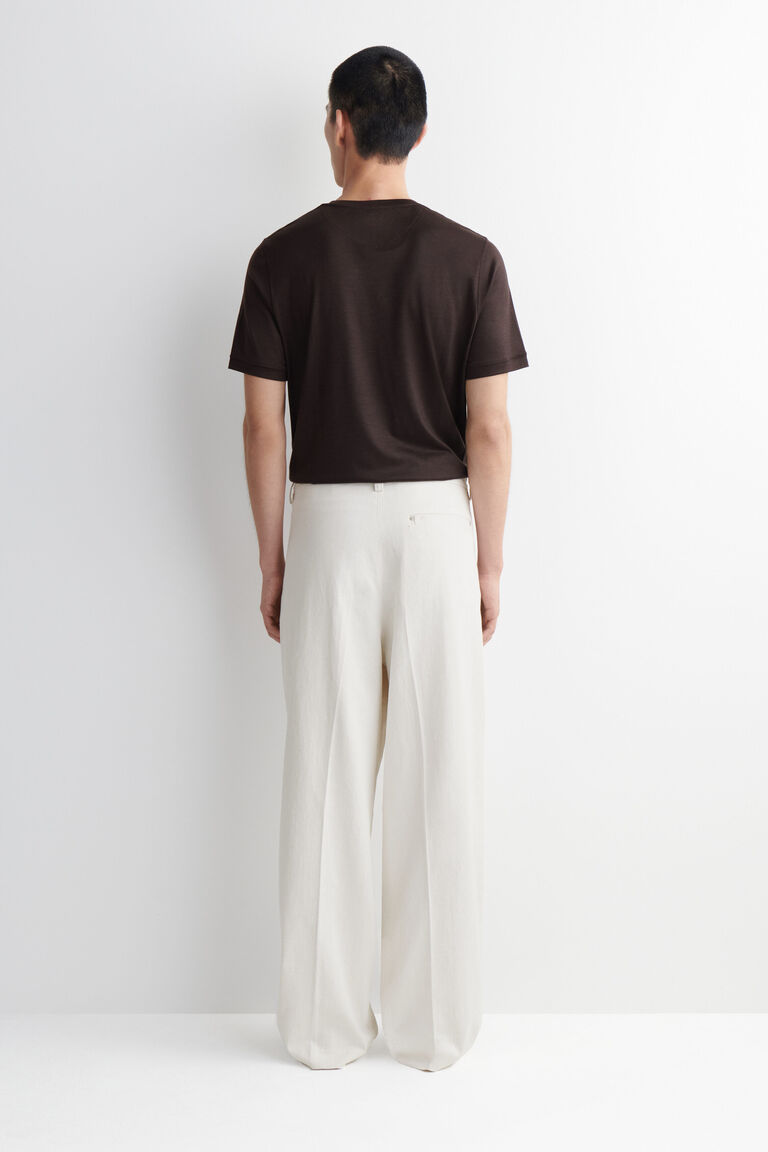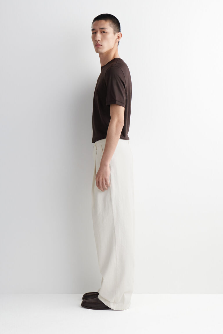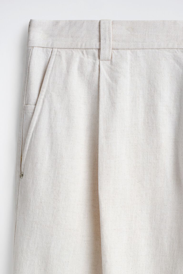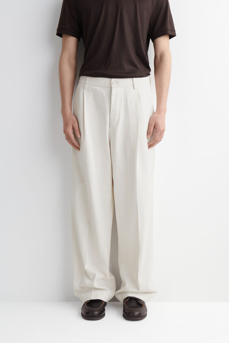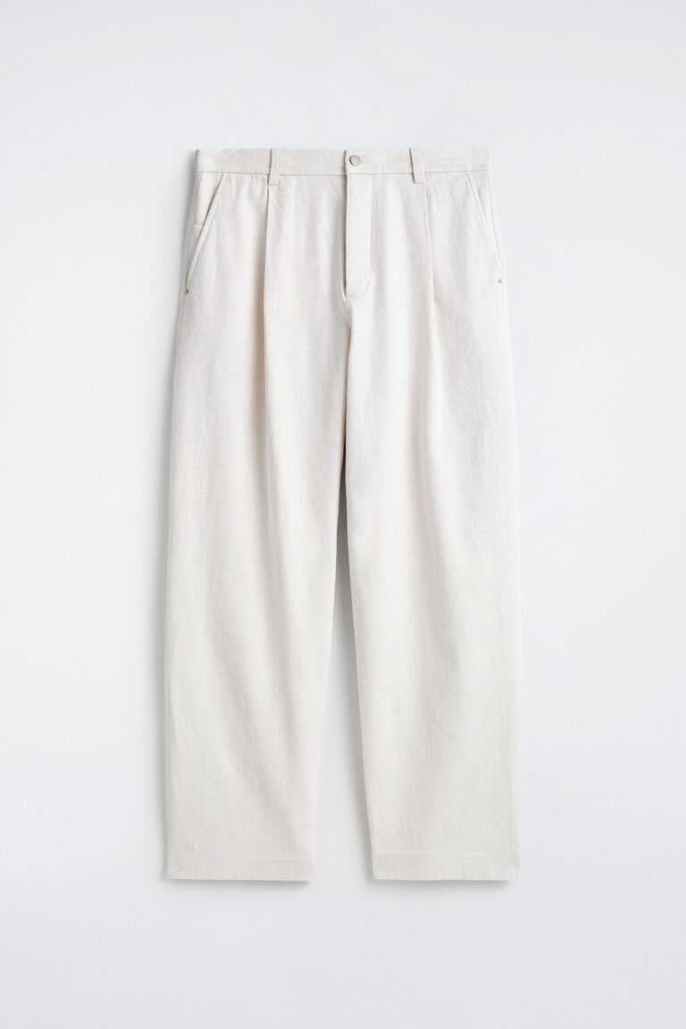 These modern trousers marry the formality of tailoring with the ease of denim. Made from an organic cotton and linen blend, they are cut in a relaxed shape with wide legs and full-length hems that pool over your shoes. A utility-inspired shank button fastens at the waistband, while slanted pockets detail the front.