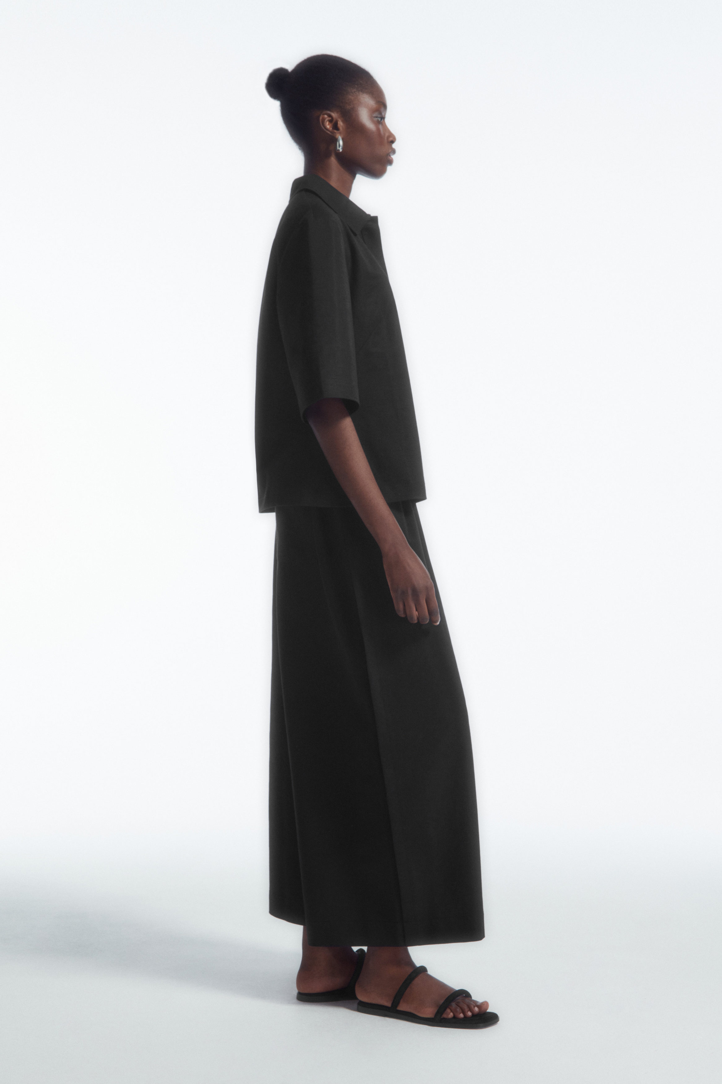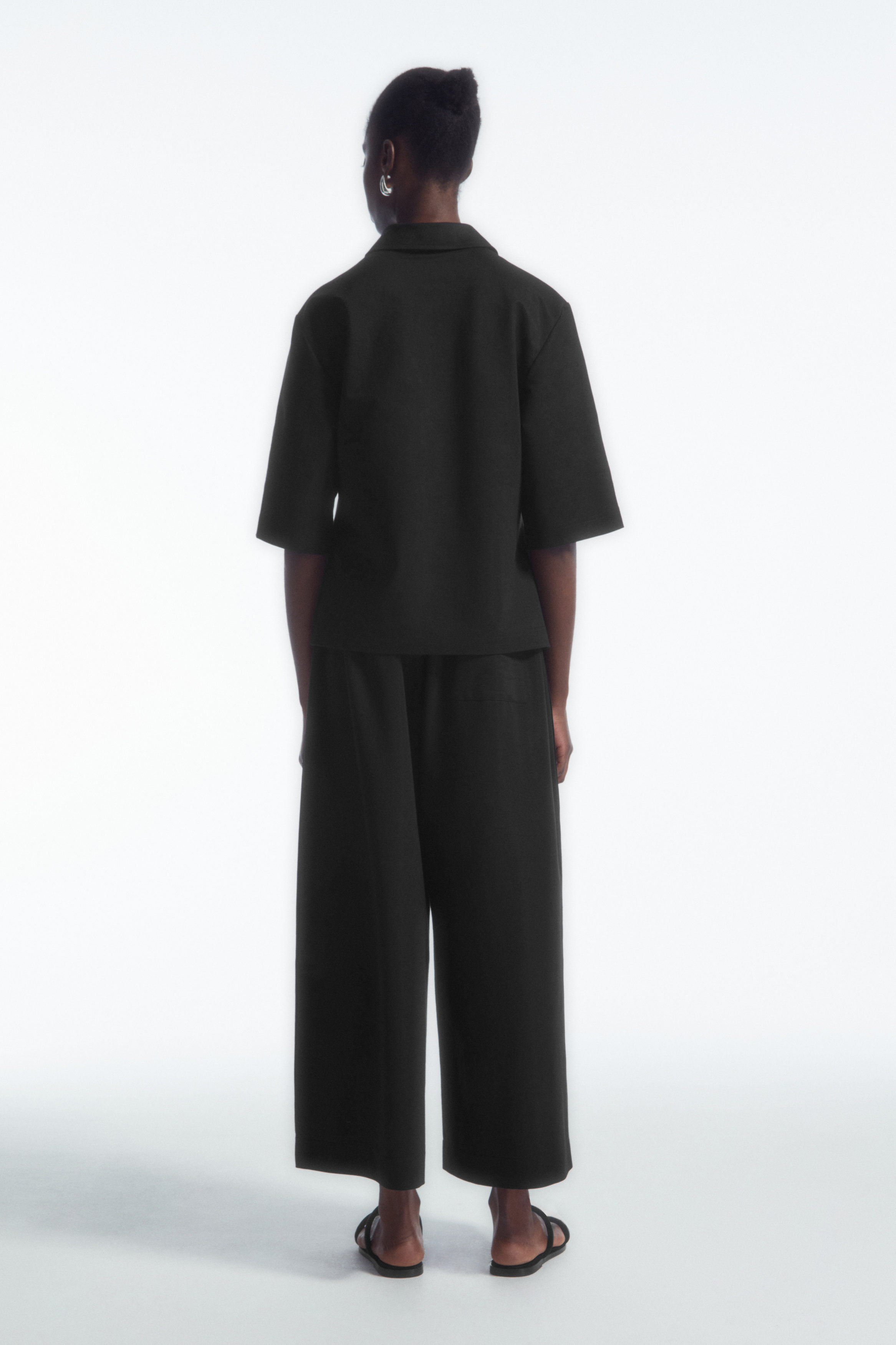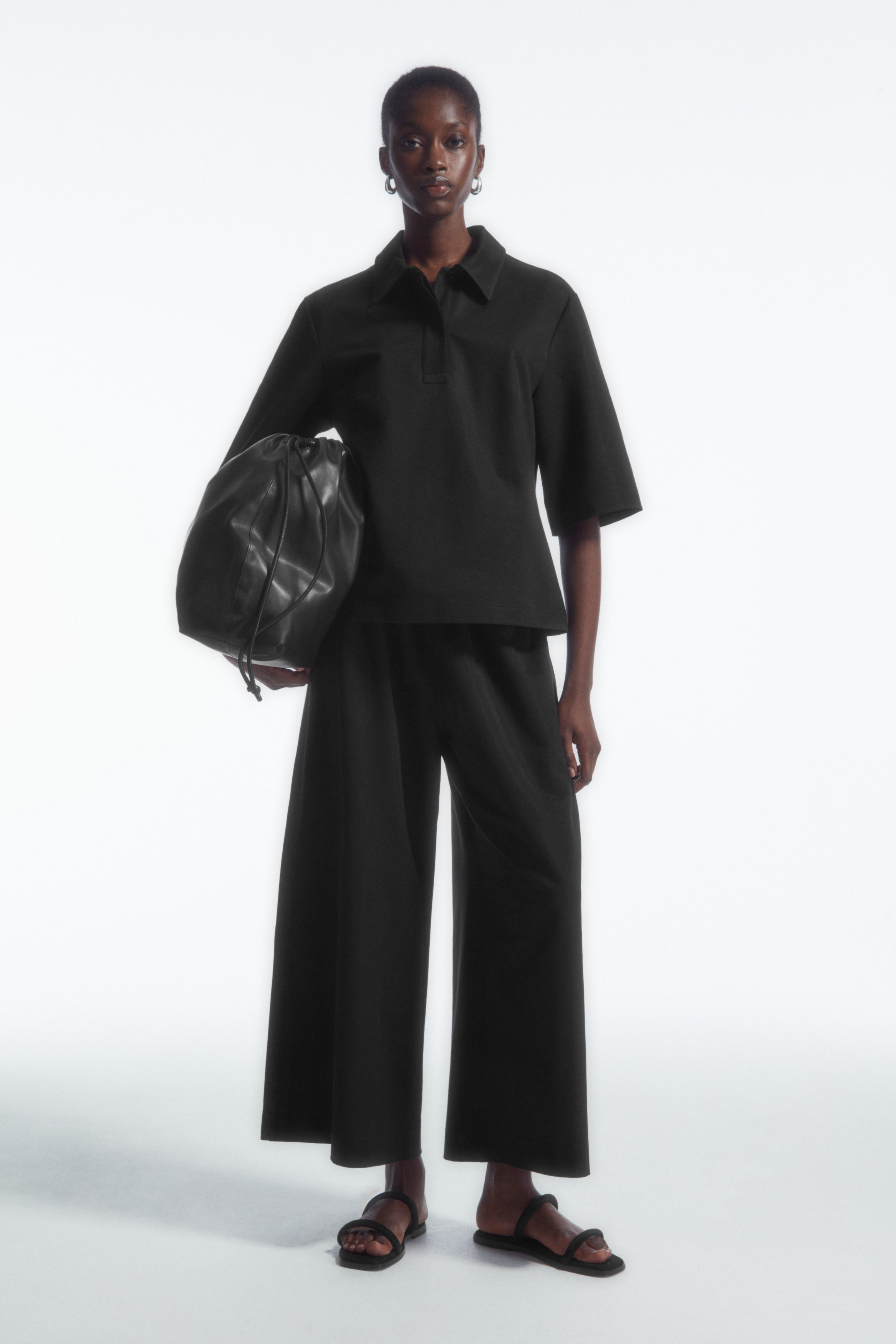 We created this refined polo shirt as a fail-safe way to look put together. The pointed collar and concealed placket offer a tasteful balance between smart and casual attire, while the oversized silhouette nods to its sportswear origins. It's crafted from the softest Pima cotton blend in an enduring black hue that matches the coordinating culottes.