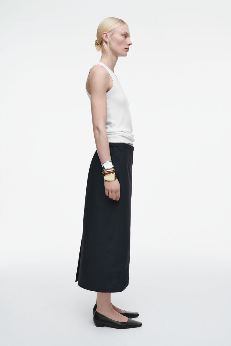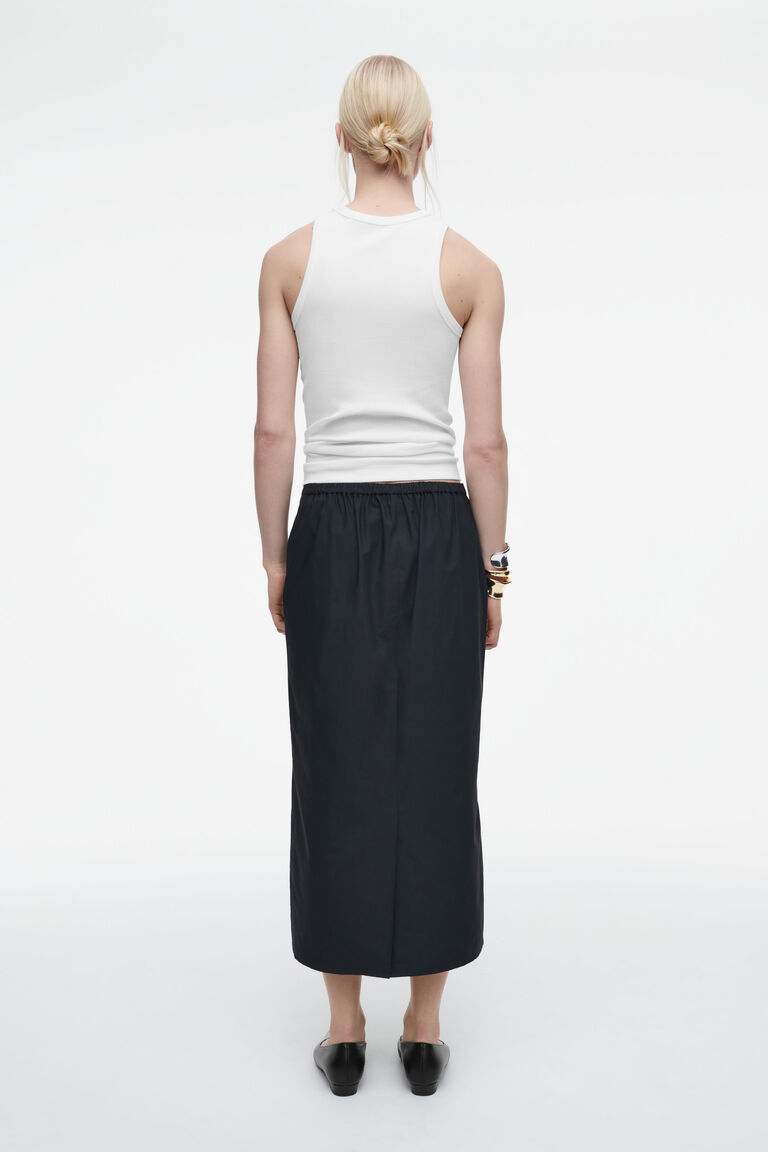 A modernised classic, this midi skirt is cut in a straight silhouette and rendered in an enduring navy tone. It's crafted from pure lightweight cotton and features an internal drawstring tie and an elasticated waistband. Style it with sandals or trainers.
