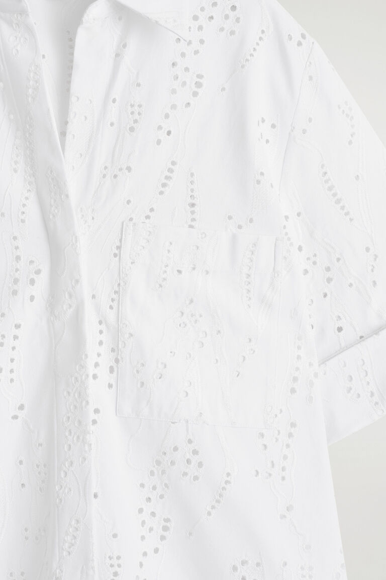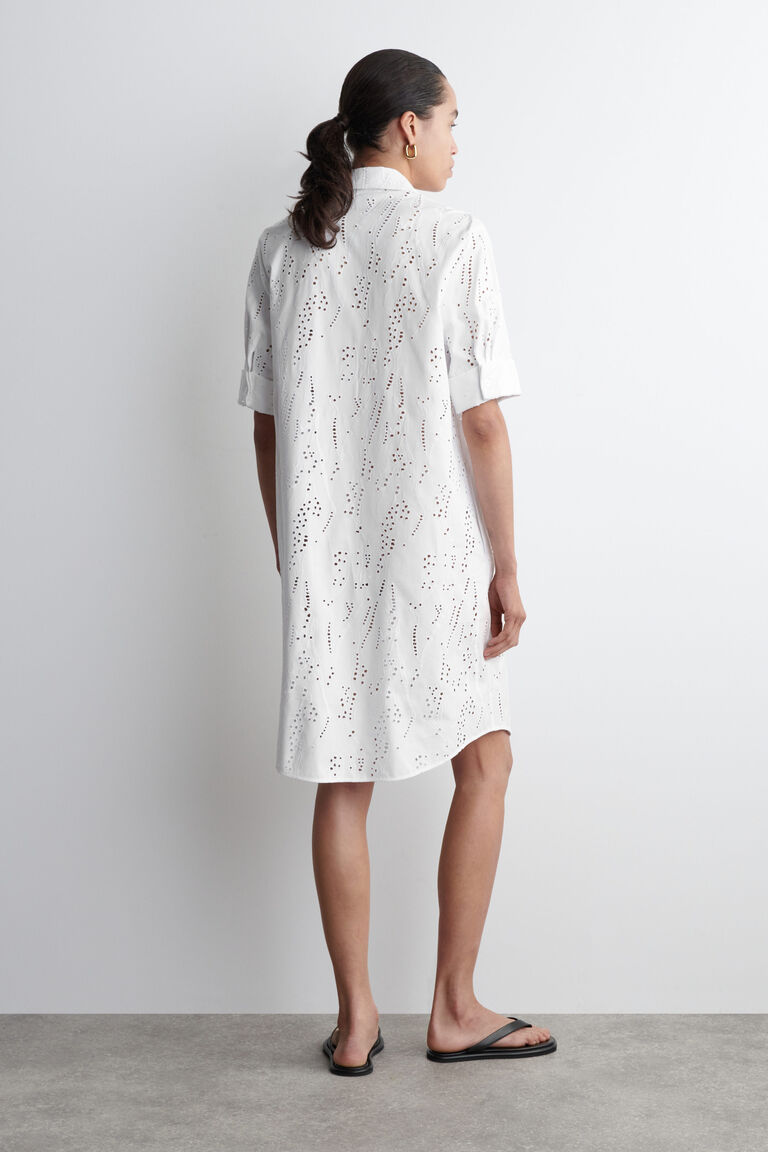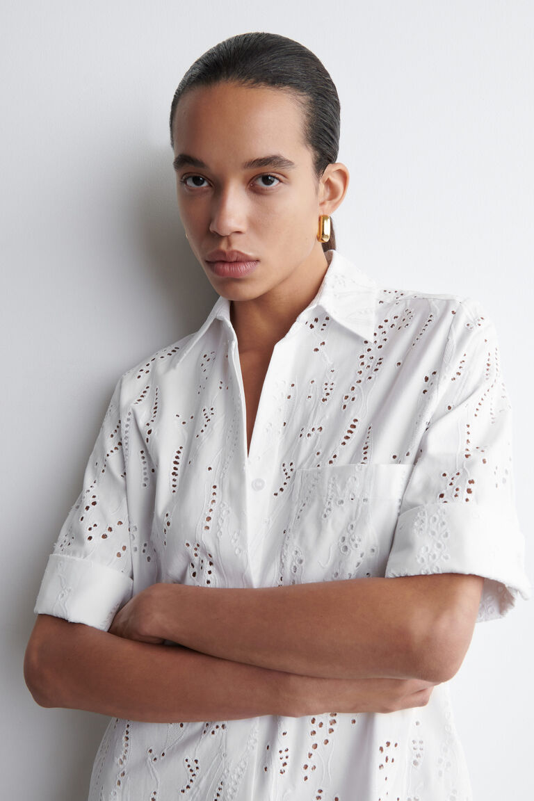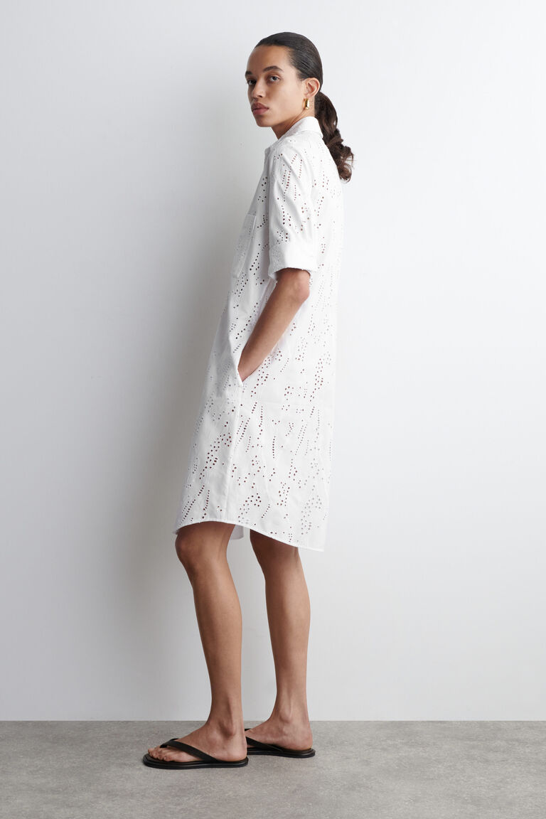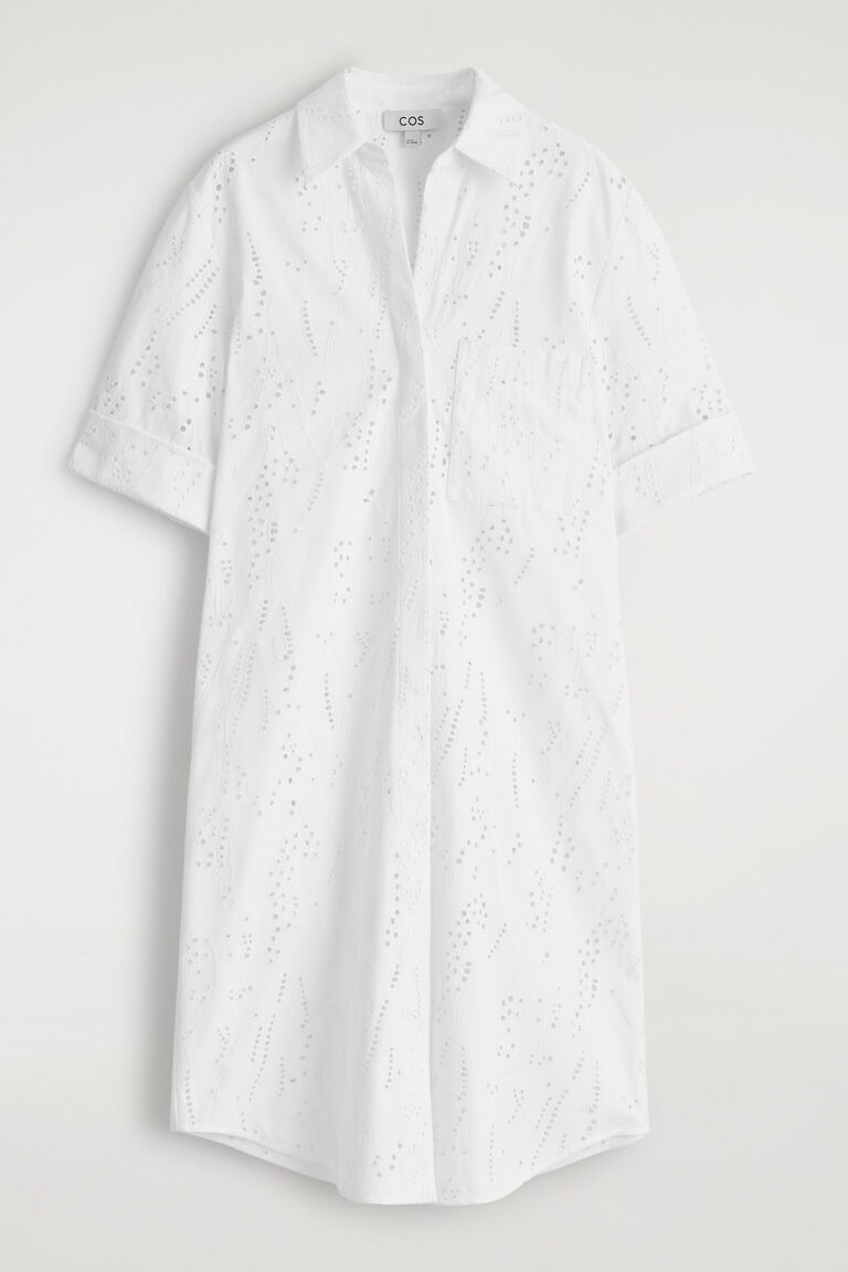 Broderie anglaise detailing renews the classic shirt dress with a modern femininity. Crafted from organic cotton, it comes in a muted white tone with intricate tonal embroidery and designed with a pointed collar, curved hem and short sleeves.