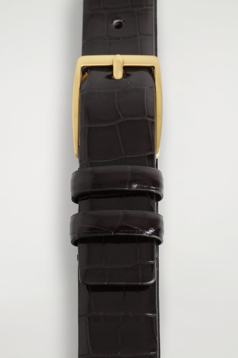 Our signature belt is reimagined through dynamic textures for the season ahead. This piece is crafted from premium patent leather that's carefully debossed with a crocodile-effect pattern and tanned using a chrome-free dyeing process.