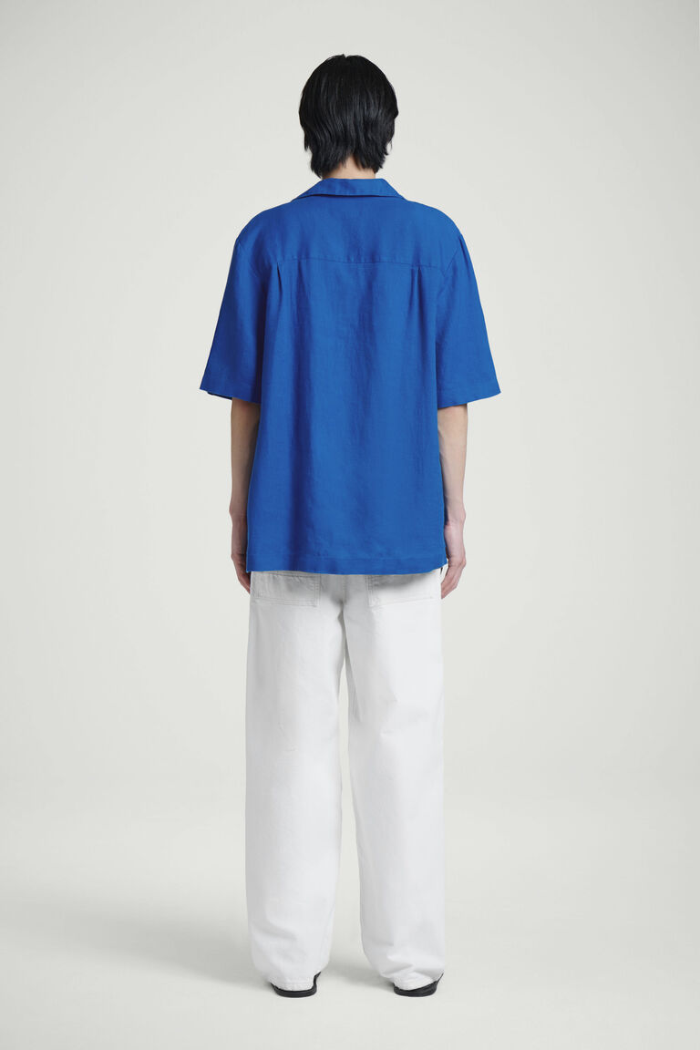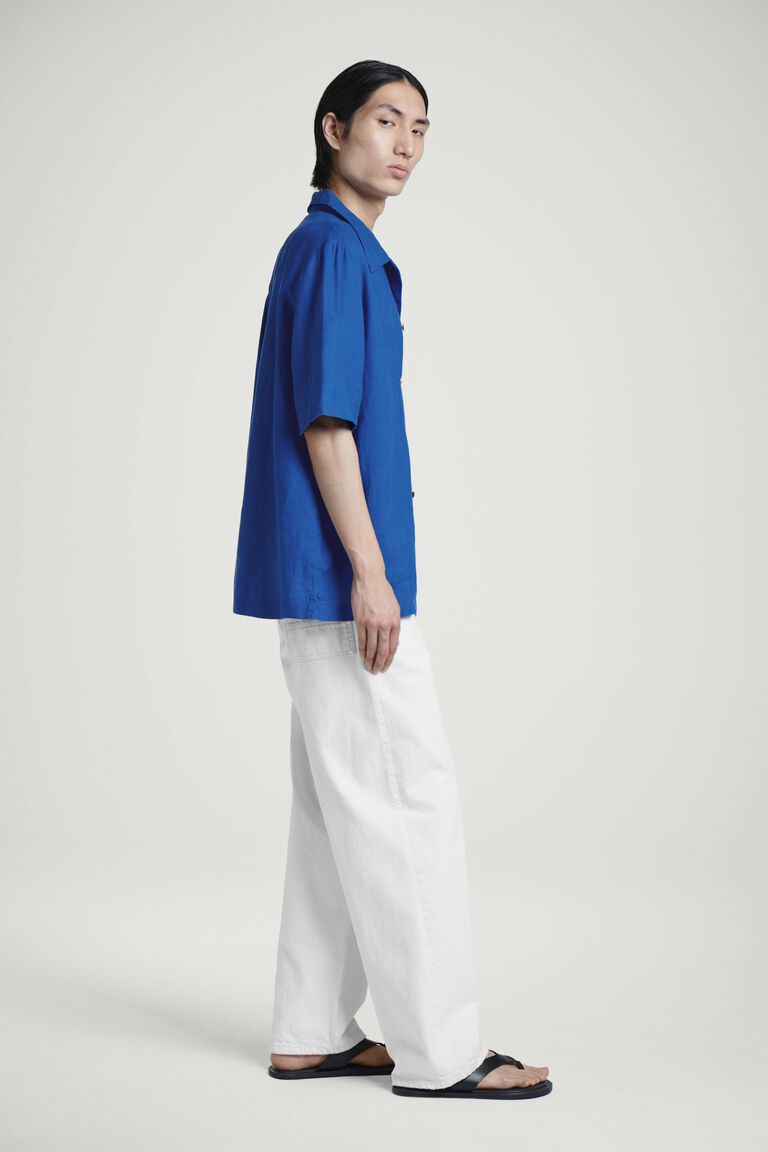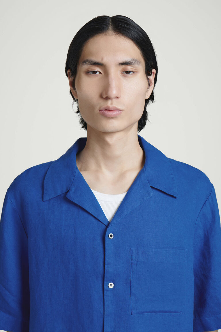 This season, the menswear team champion a relaxed sensibility through the effortless quality of linen. This lightweight shirt is designed with blue stripes and features a camp collar, short sleeves and chest pocket. It's finished with mother-of-pearl buttons, the final one sewn horizontally – a COS design signature.