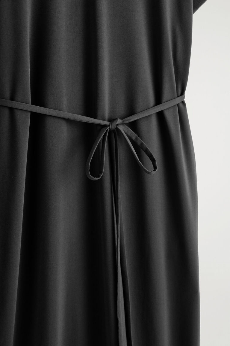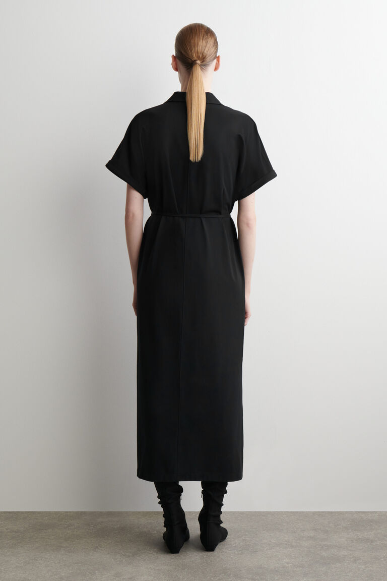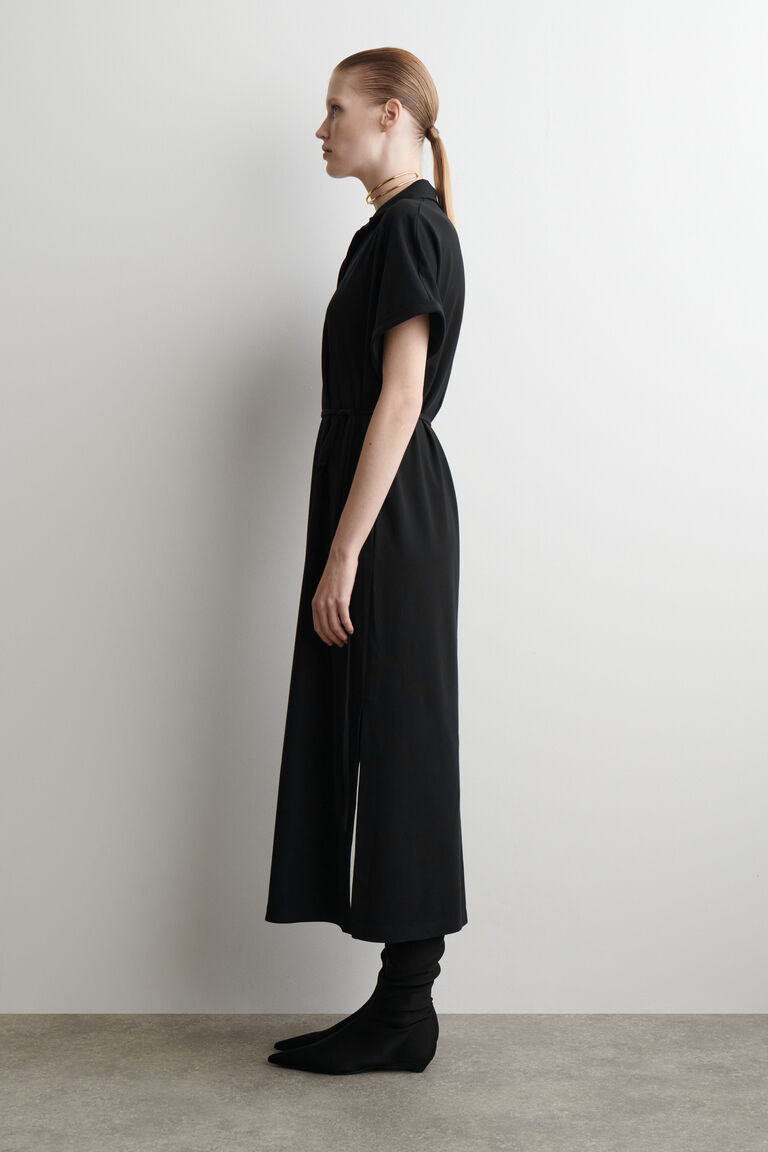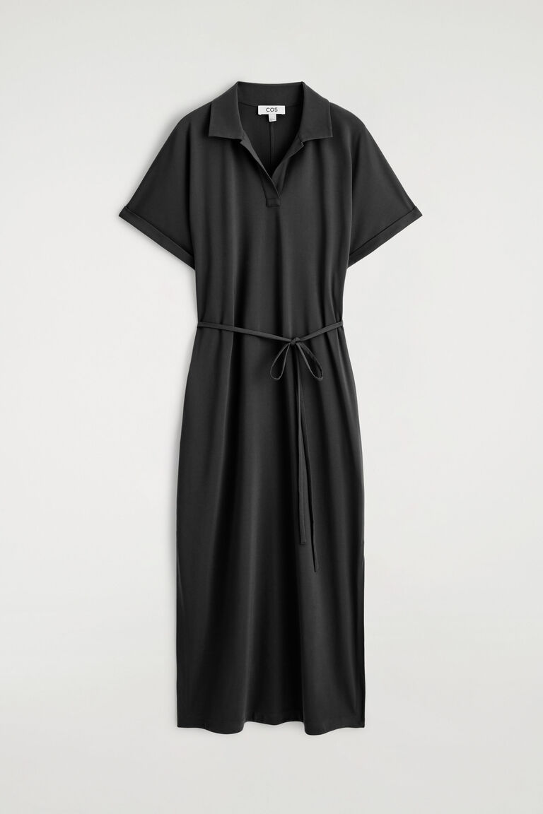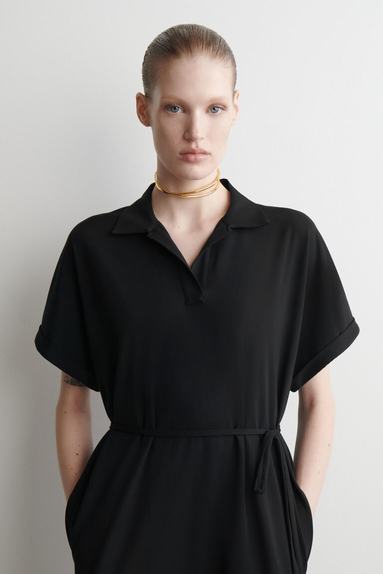 The COS dress collection celebrates timelessness and versatility. Crafted from soft jersey, this piece is designed with a classic polo collar, a tonal belt at the waist and a relaxed silhouette with slits at either side of the hem.