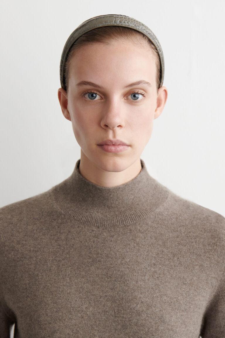 The COS accessories collection explores the dynamic textures of Autumn Winter 2025. This refined headband is crafted from butter-soft leather and embossed with a tactile crocodile-effect motif. Style it with your hair swept back.