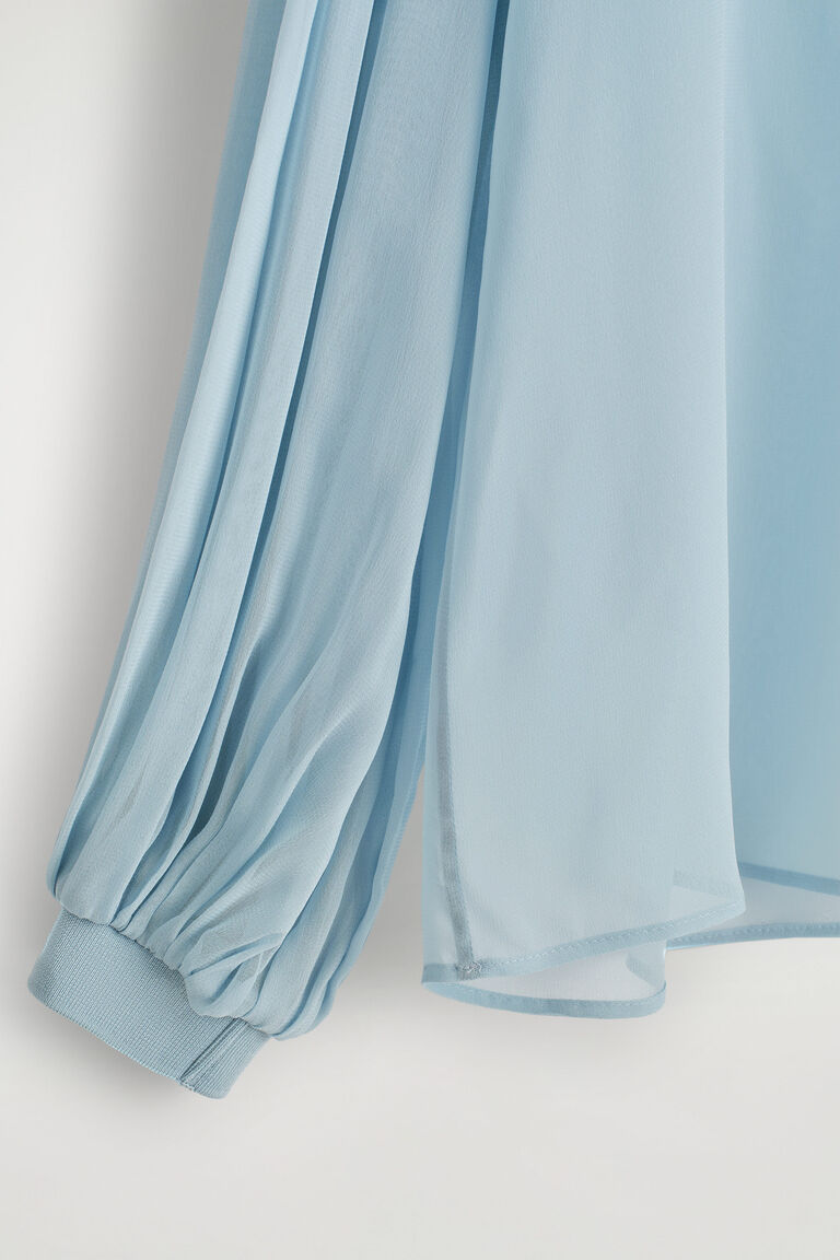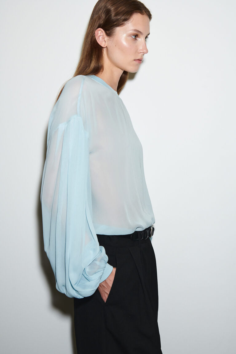 Rendered in a sky-blue tone, this sheer blouse is crafted from delicate georgette and features a ribbed crew neckline, voluminous balloon sleeves and a subtle keyhole cutout at the back. Style it with tailored trousers, creating an interplay between structure and softness.