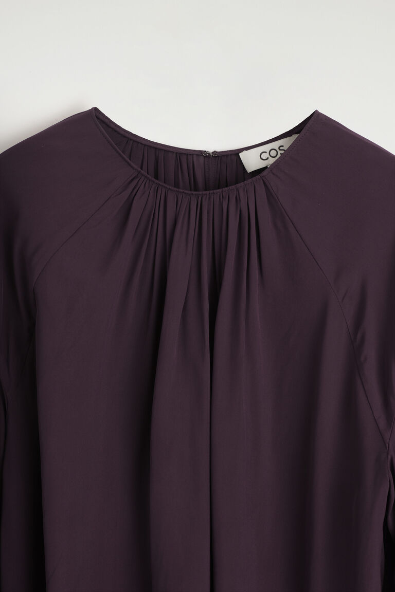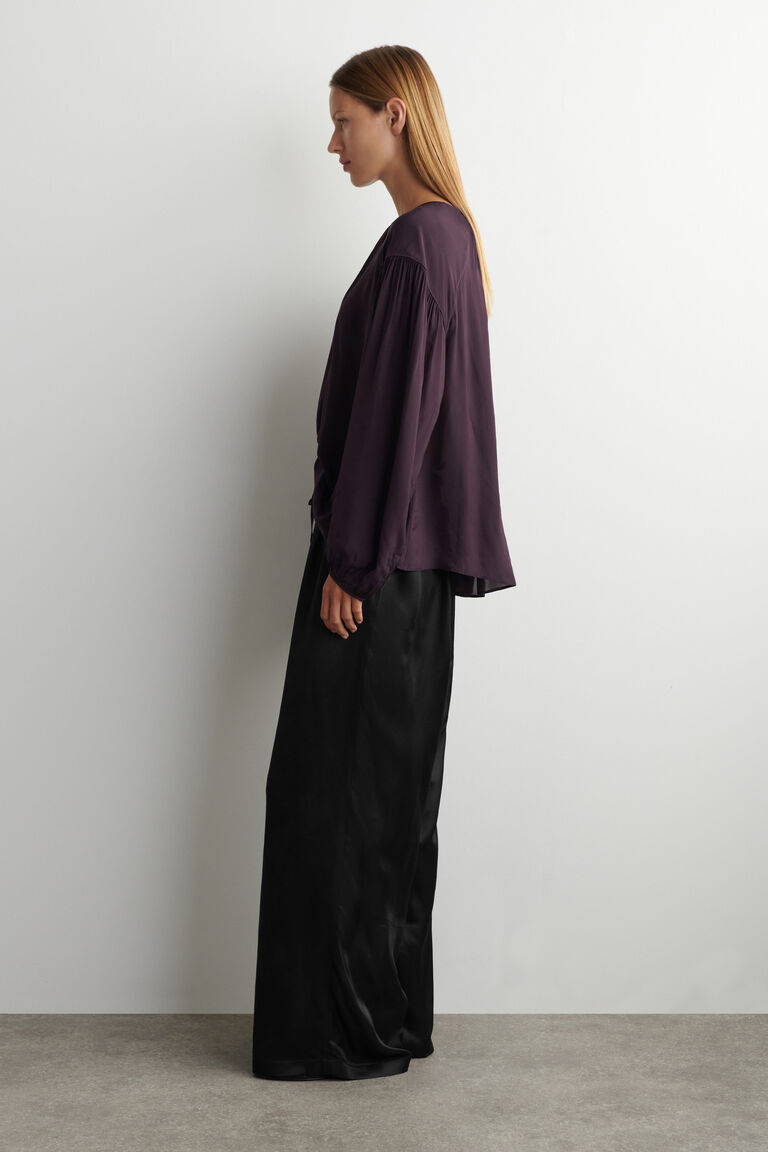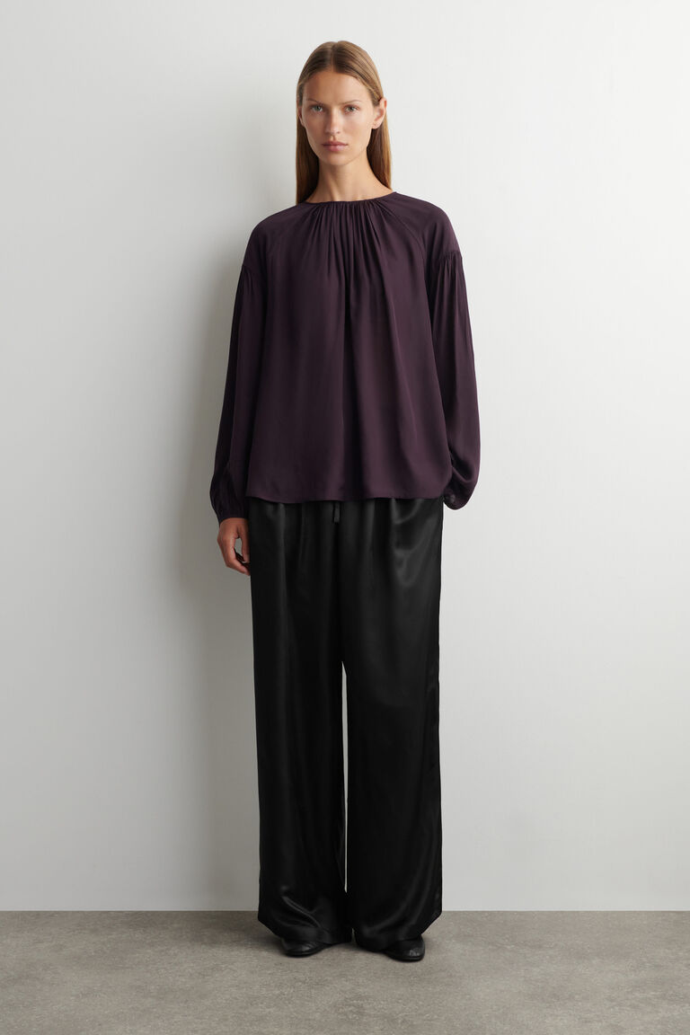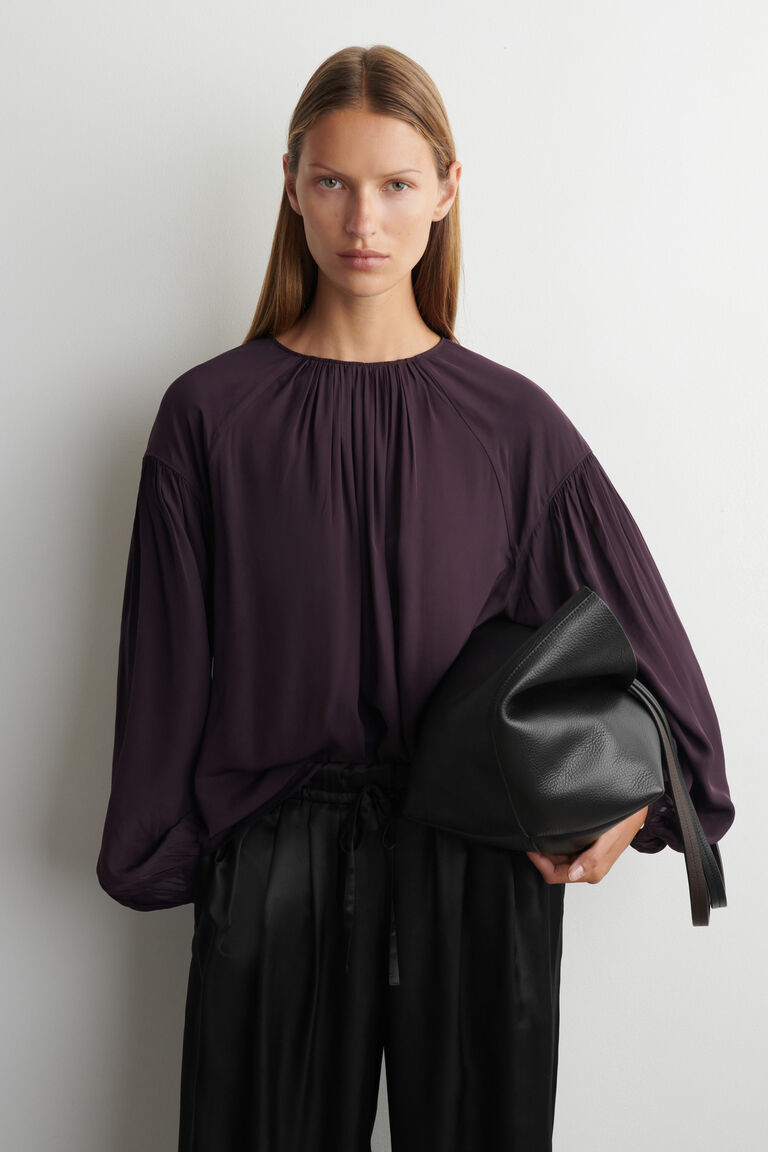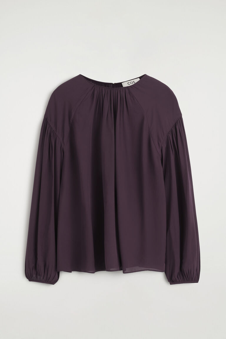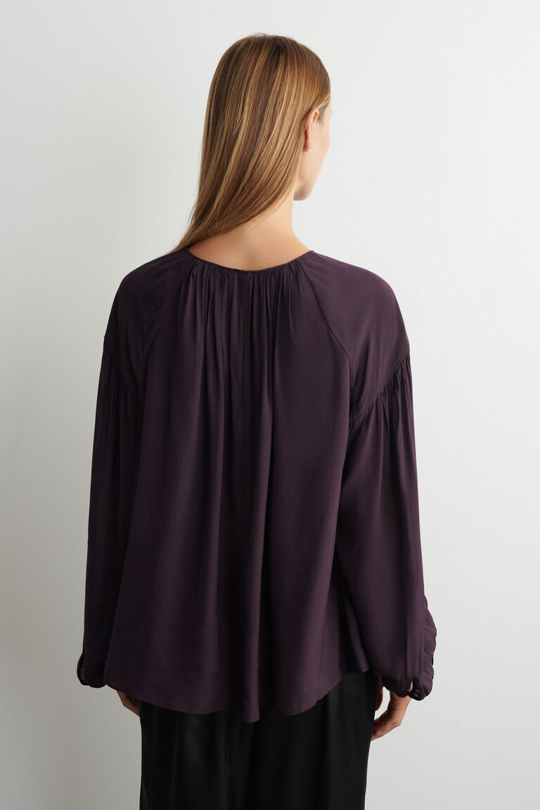 Voluminous in shape, this airy blouse is offered in a rich plum hue and designed with gathered detailing at the neckline, shoulders and cuffs. Embrace the relaxed silhouette by styling it with wide-leg trousers.