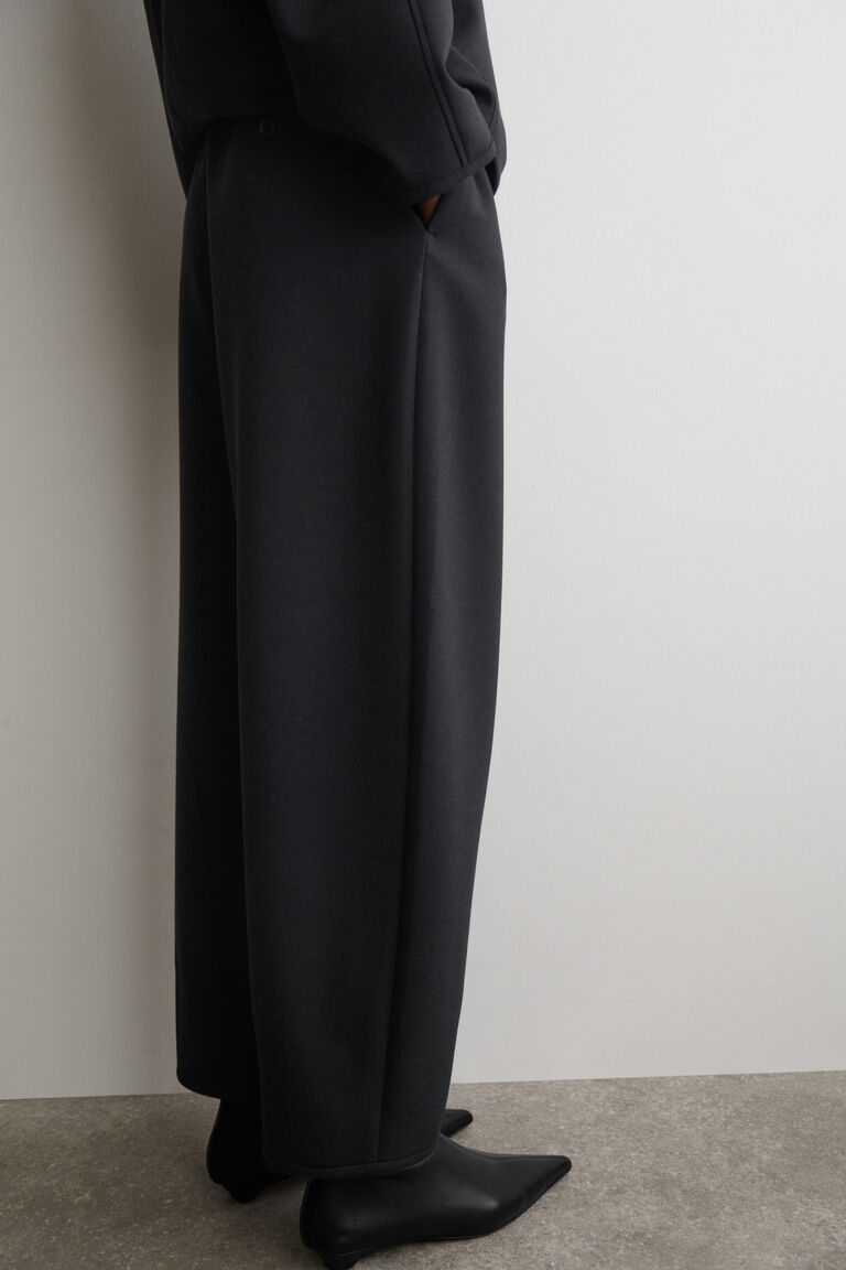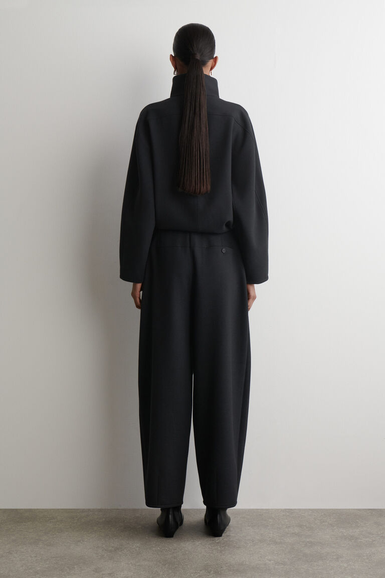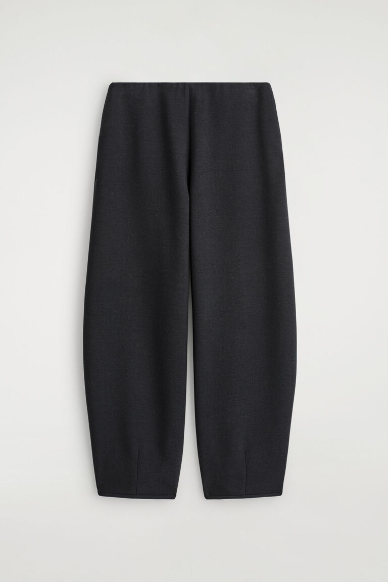 These modern trousers offer a tailored take on classic loungewear. Offered in muted charcoal, they're made from a woven fabric in a barrel-leg silhouette and feature darts at the waist and ankle to temper the shape. Style them as a co-ord with the matching top.