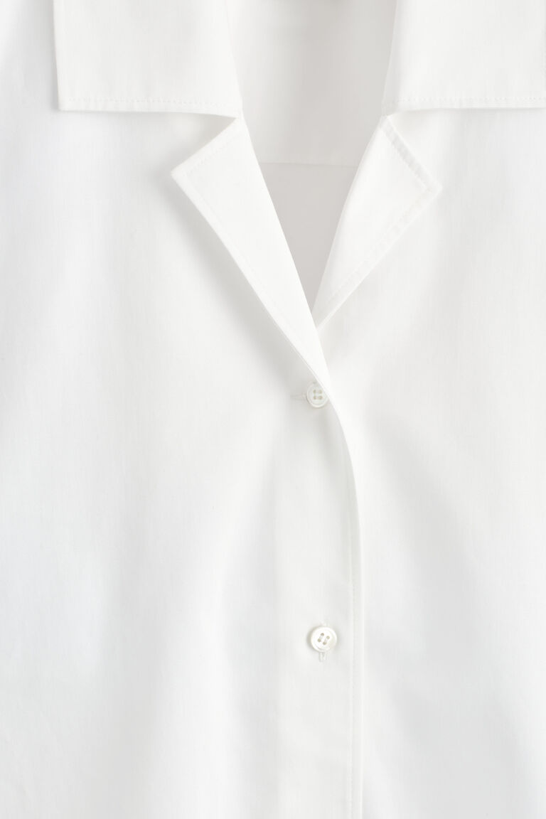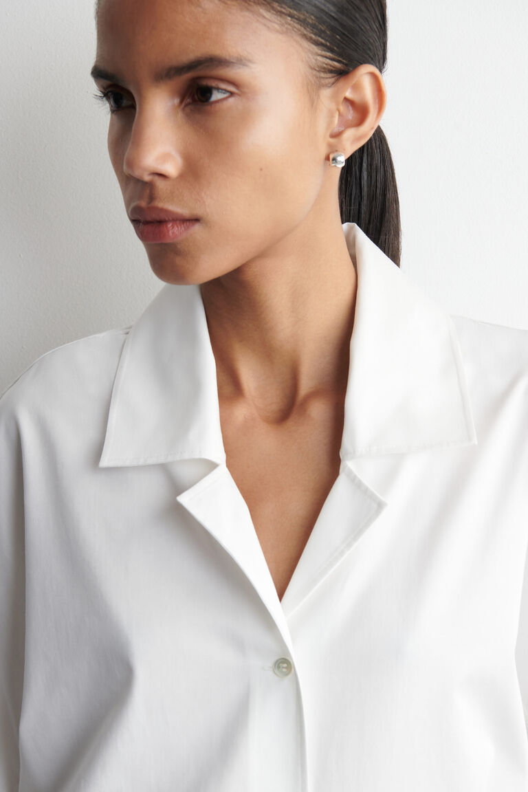 This season, the womenswear team renew classic shirting codes. Made from soft cotton, this piece is cut in a sculptural silhouette and features an open collar, exaggerated shoulders and cropped sleeves.