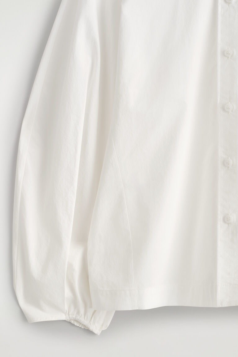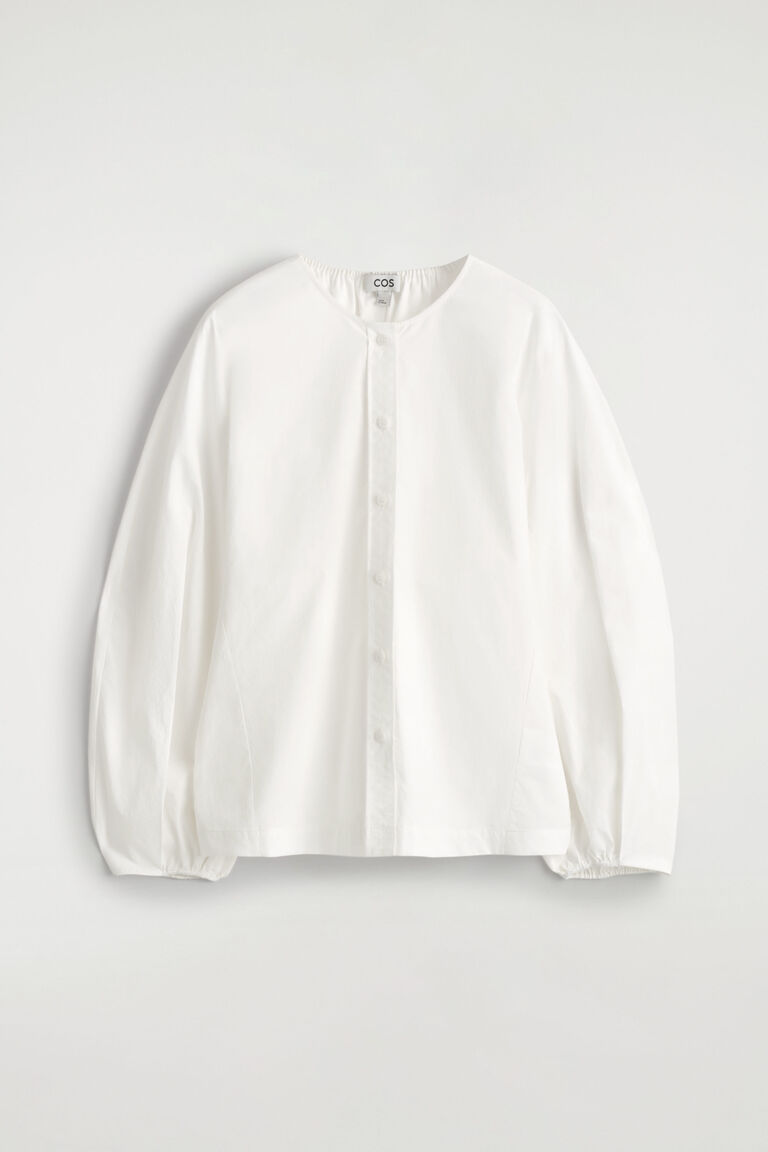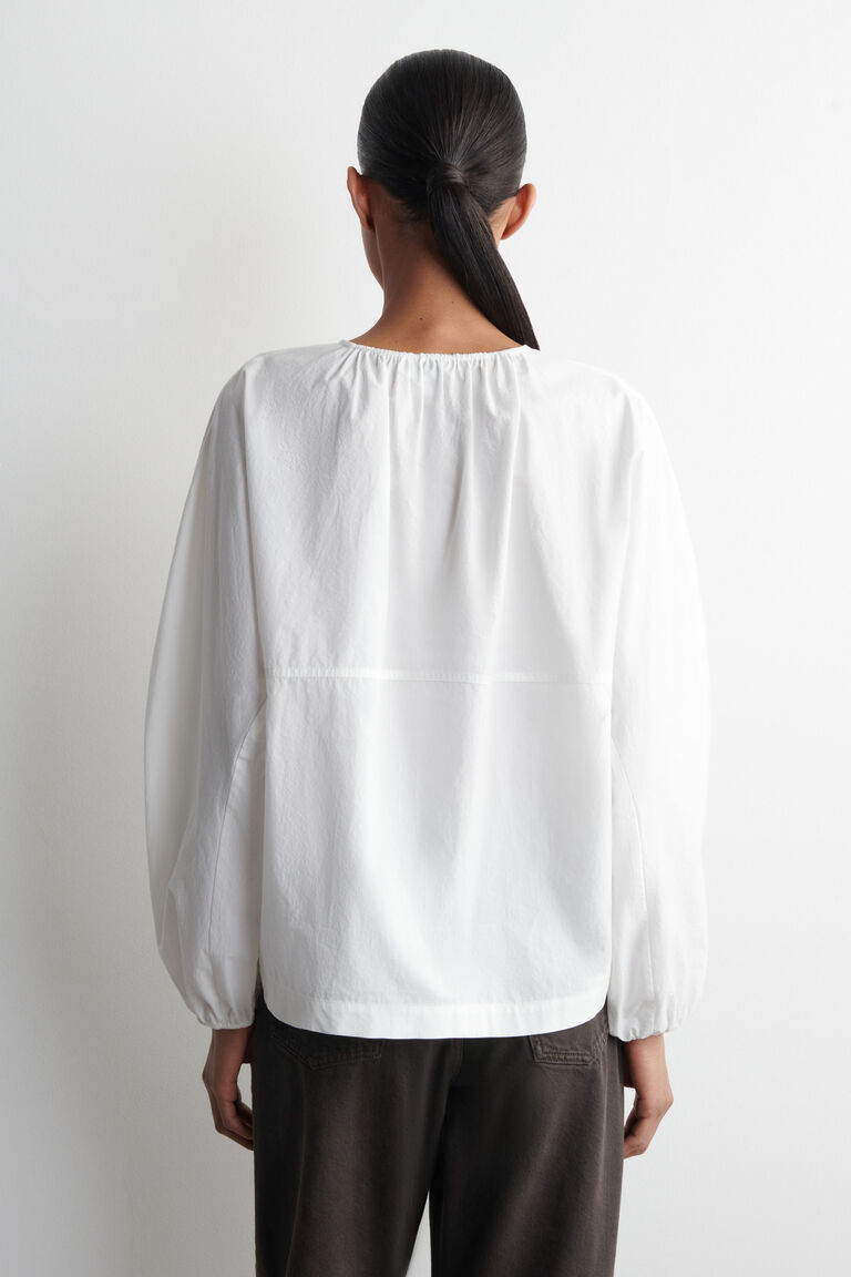 Crafted from soft Pima cotton, this blouse is cut in a rounded shape with subtle gathering at the nape and pleat detailing at each cuff. Style it with denim for off-duty days.