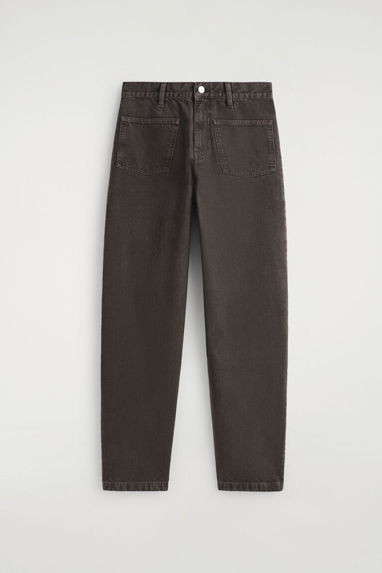 New dimensions in denim: these modern jeans are designed with a high waist and '70s-inflected patch pockets. They're cut from 11oz cotton-denim in a straight-leg shape and washed a rich chocolate tone that complements a wardrobe of neutrals.