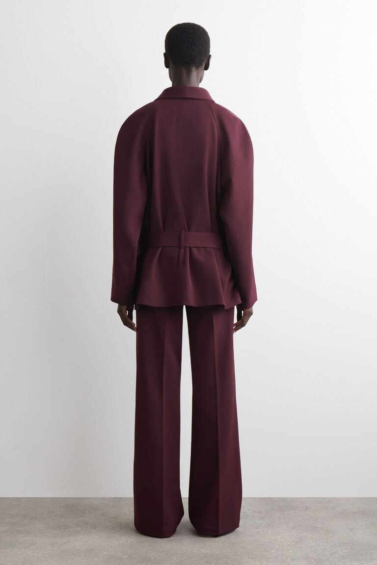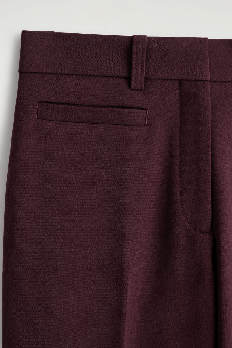 Rendered in a rich burgundy tone, these modern trousers are made from a tactile wool blend and designed with straight, press-creased legs, welt pockets and belt loops. Pair them with a tonal palette.