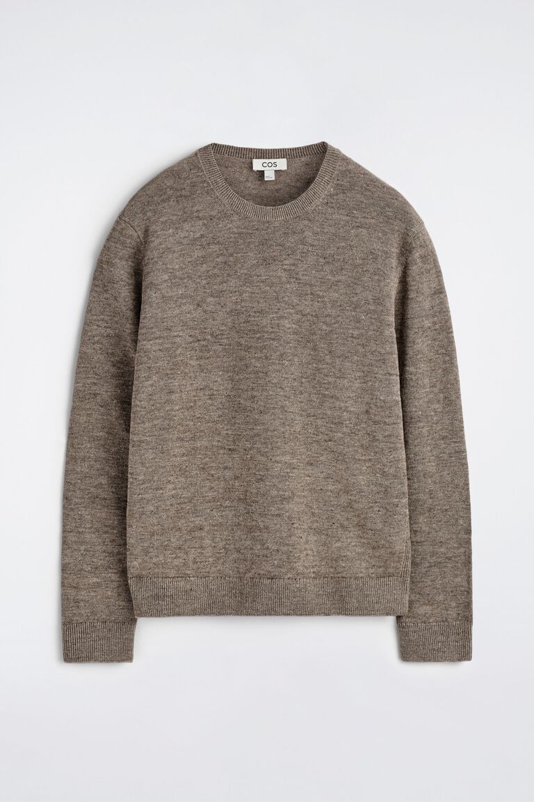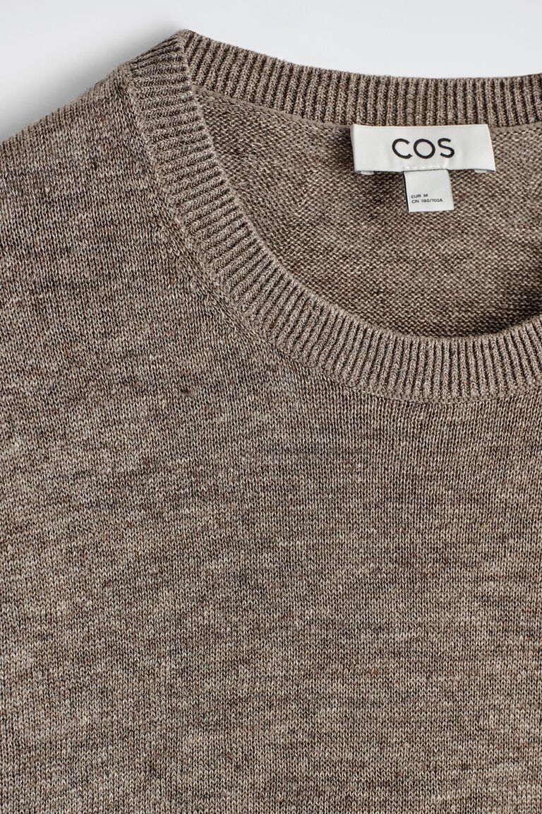 The COS menswear collection is anchored by refined staples like this jumper. Offered in classic taupe, it's knitted from naturally breathable linen and features a ribbed crew neck, side panels, cuffs and hem.