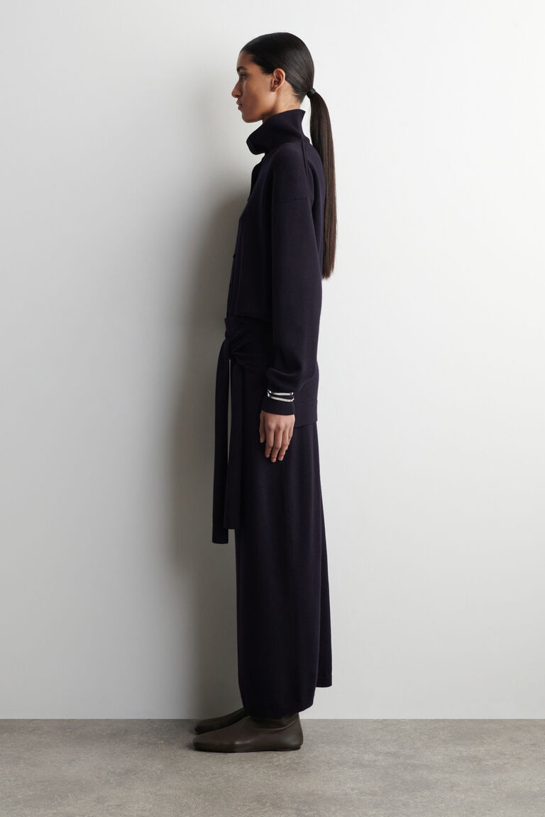 This season, the classic cardigan is renewed with a refined sensibility. This piece is knitted from ultra-soft, fine merino wool and designed with a versatile neckline – wear it as a funnel neck or effortlessly unbuttoned. Style it as a coord with the matching trousers.