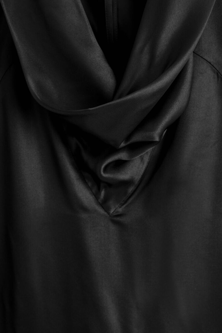 This modern high-neck blouse is cut in a draped silhouette with a bias-cut scarf that ties effortlessly towards the back. It's made from a lightweight silk blend and comes in a rich chocolate-brown tone that styles well with tailoring and jeans alike.