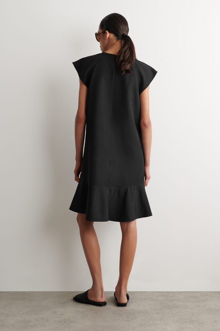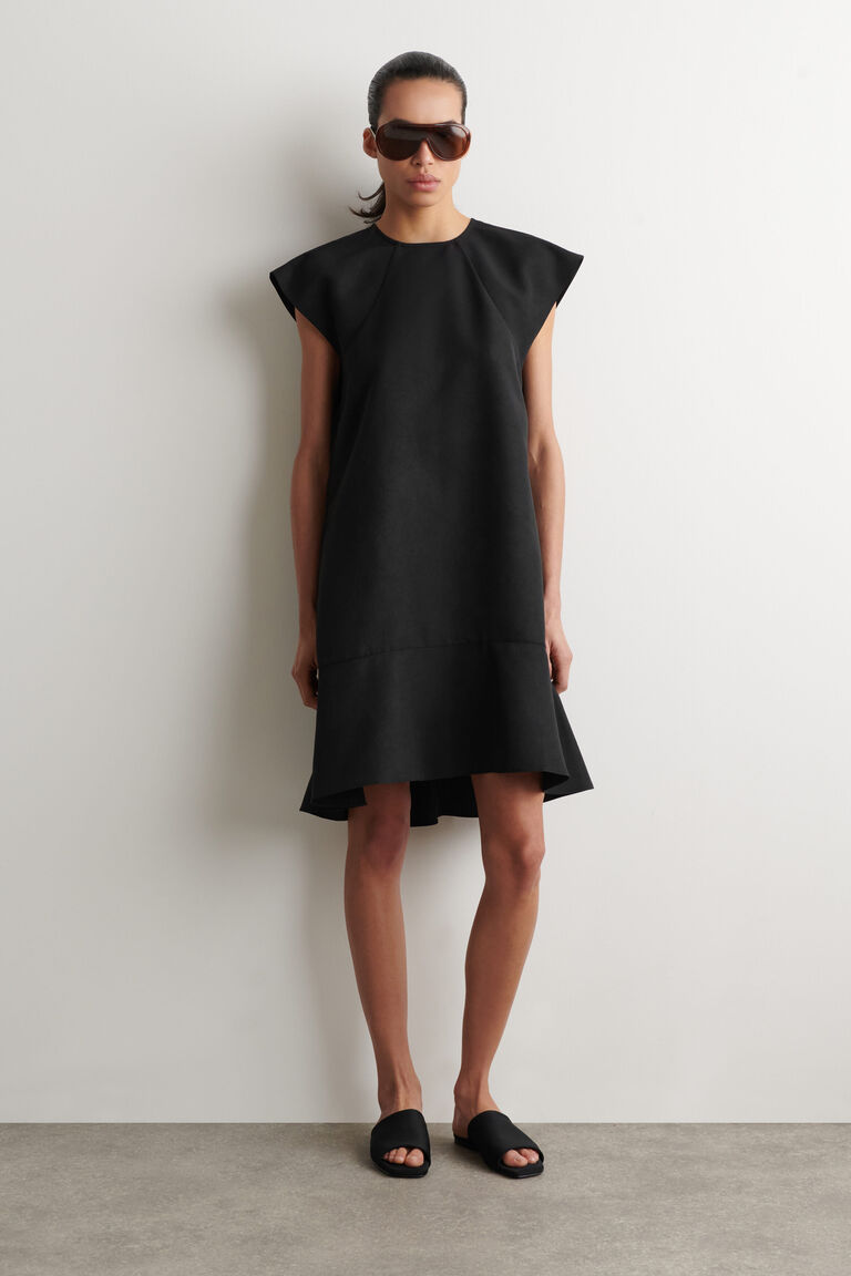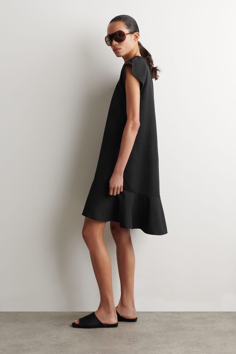 Softened silhouettes signal a new dressing mindset for Spring Summer 2026. This fluid dress is made from crinkled fabric that subtly sculpts the form and designed with a high neckline, delicate cap sleeves and a flared peplum hem. The French seams and pin hem lend a considered finish.