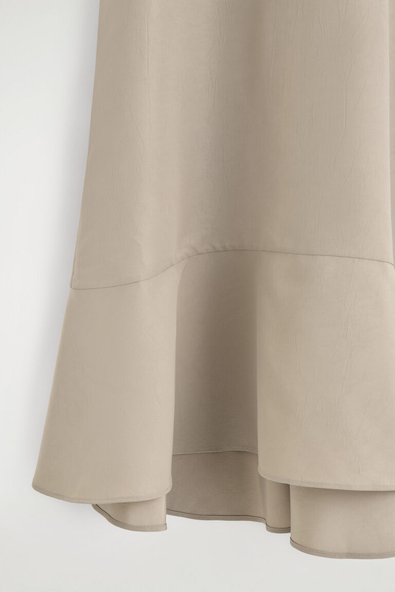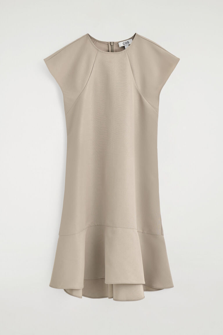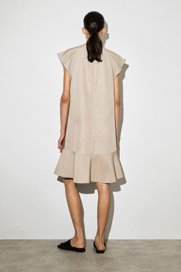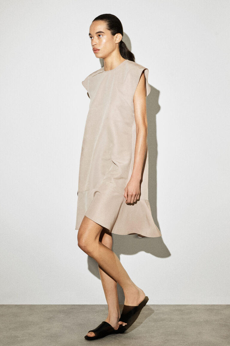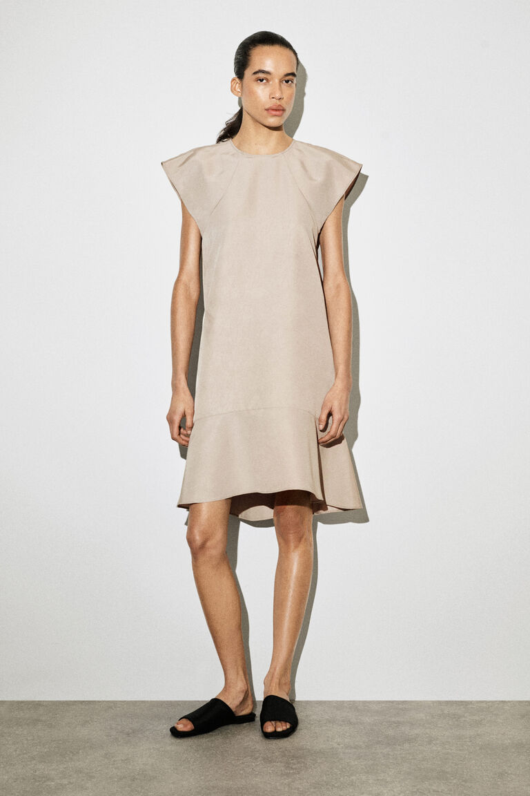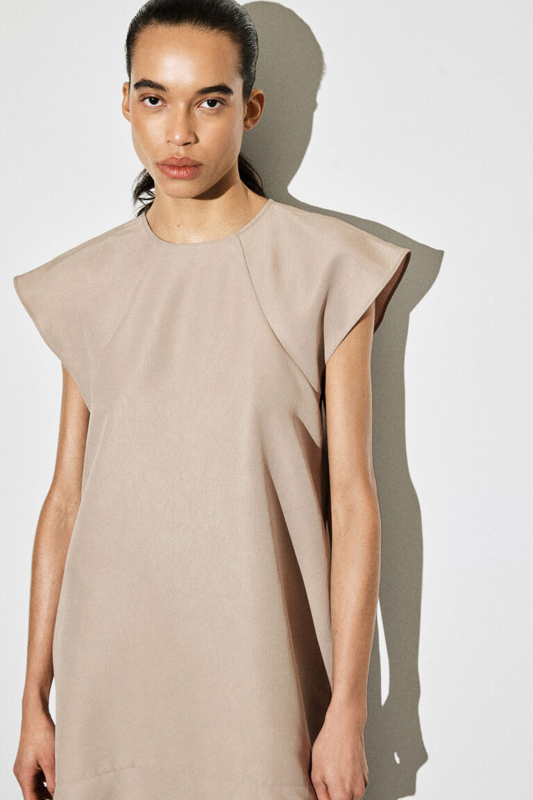 Softened silhouettes signal a new dressing mindset for Spring Summer 2026. This fluid dress is made from crinkled fabric that subtly sculpts the form and designed with a high neckline, delicate cap sleeves and a flared peplum hem. The French seams and pin hem lend a considered finish.