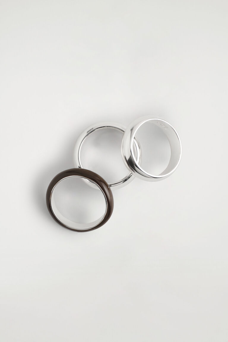 These refined rings are simple yet impactful. Within the 3 pack, they're crafted from brass that's plated with gold for a polished shine, while one piece is lacquered with rich brown resin. Wear them stacked on top of each other for a modern take on layering.