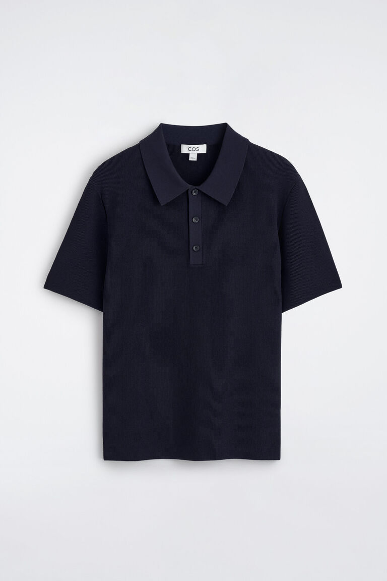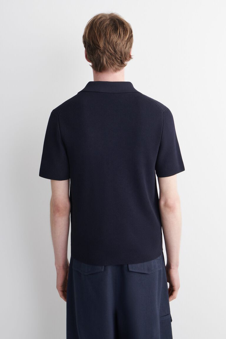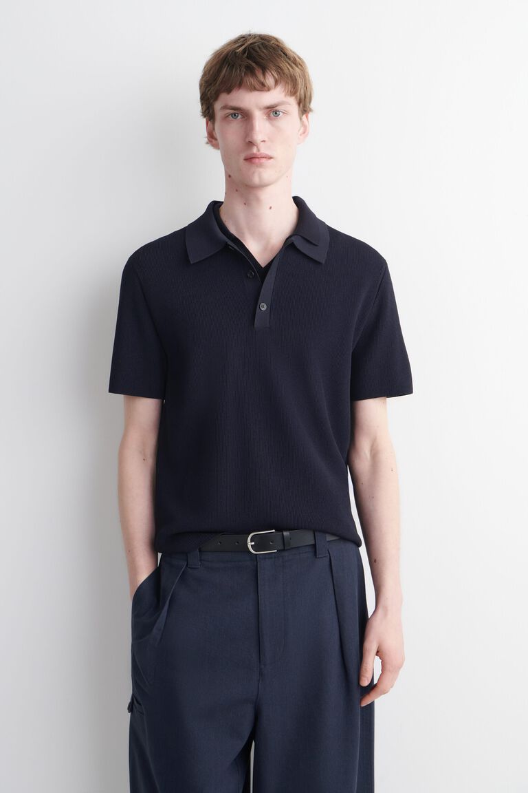 Slim shapes and textured knits come to the fore in this season's collection. This modern polo shirt is bouclé-knitted in a ribbed cardigan stitch and has a smooth polo collar. Style it with classic denim or chinos.