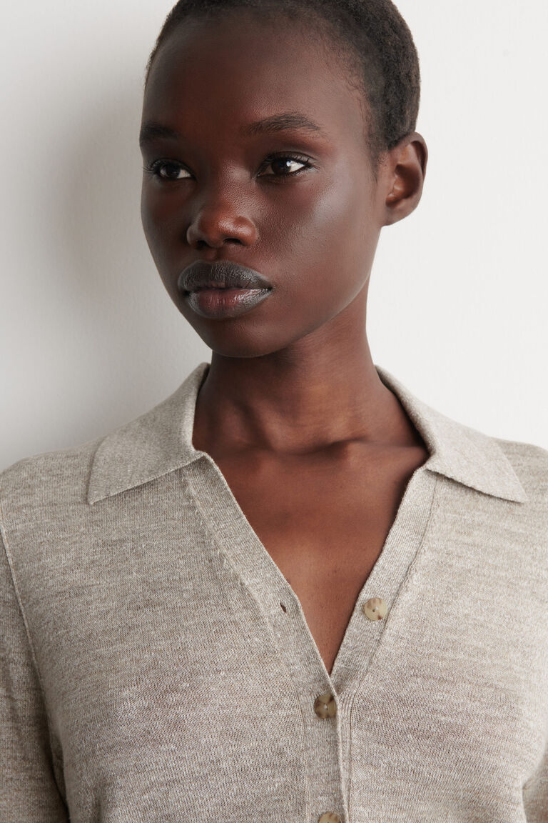 This refined short-sleeved shirt is knitted from merino wool and linen, lending luxurious softness and a rich tactility. It's rendered in a nuanced stone-beige tone and designed with an open collar, finely ribbed trims and fashioned detailing at the shoulders.