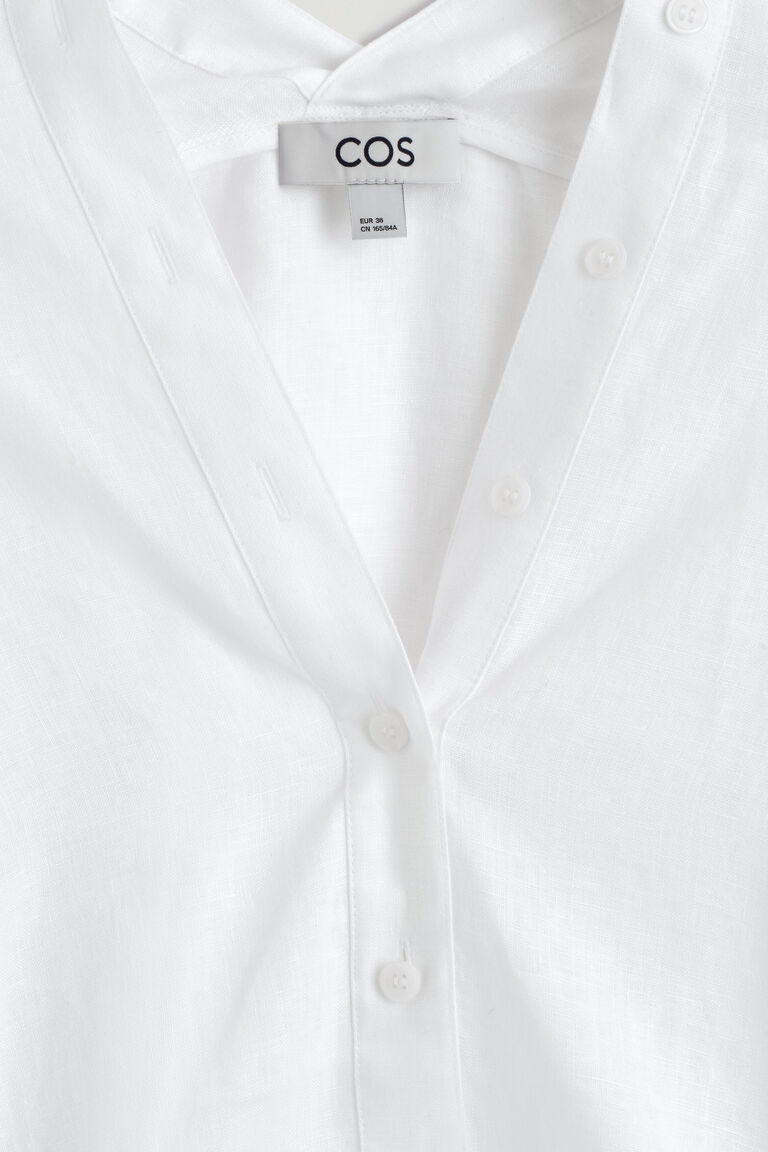 Effortless yet refined, this shirt is crafted from naturally breathable linen in a classic white tone. It's designed with a row of tonal buttons that underscore the V-shaped placket and extend towards the back of the neckline.