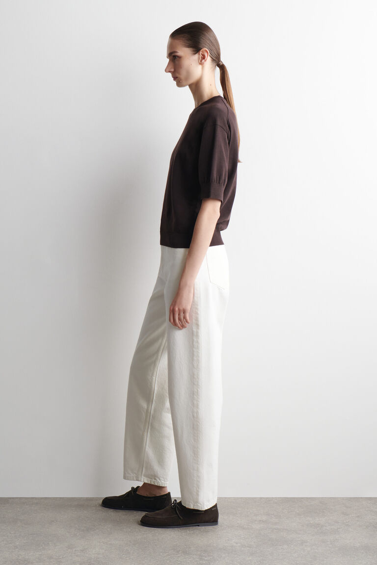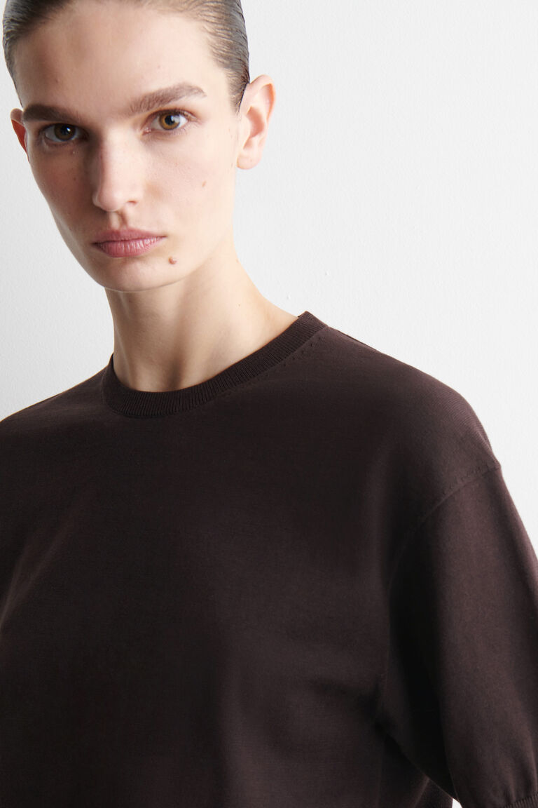 Refined essentials bring a fresh direction to the daily wardrobe. Offered in an earthy chocolate tone, this T-shirt is knitted from ultra-soft cotton and designed with a ribbed crew neck, short puffed sleeves and a ribbed hem.