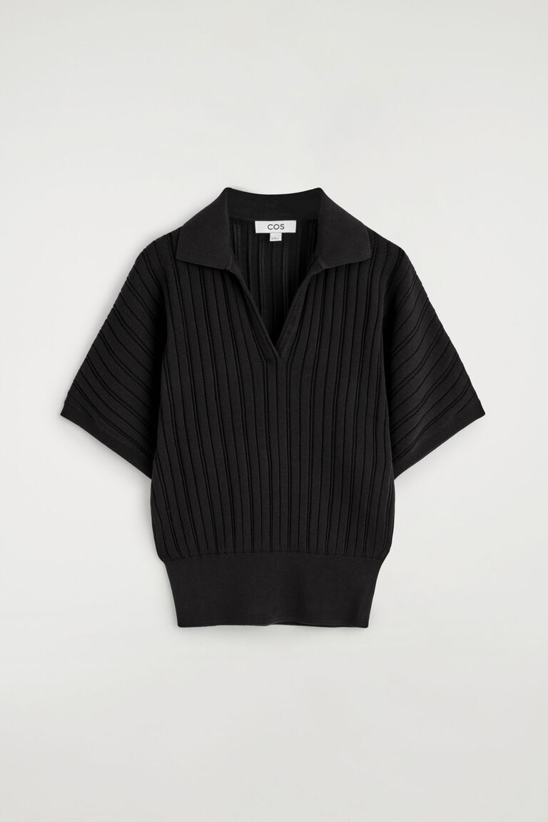 Demonstrating the COS codes of craftsmanship, this refined polo top is rendered in alternating pointelle and plain stitches, creating a semi-sheer, ribbed effect. It's made from soft cotton and shaped with an open collar and batwing sleeves.