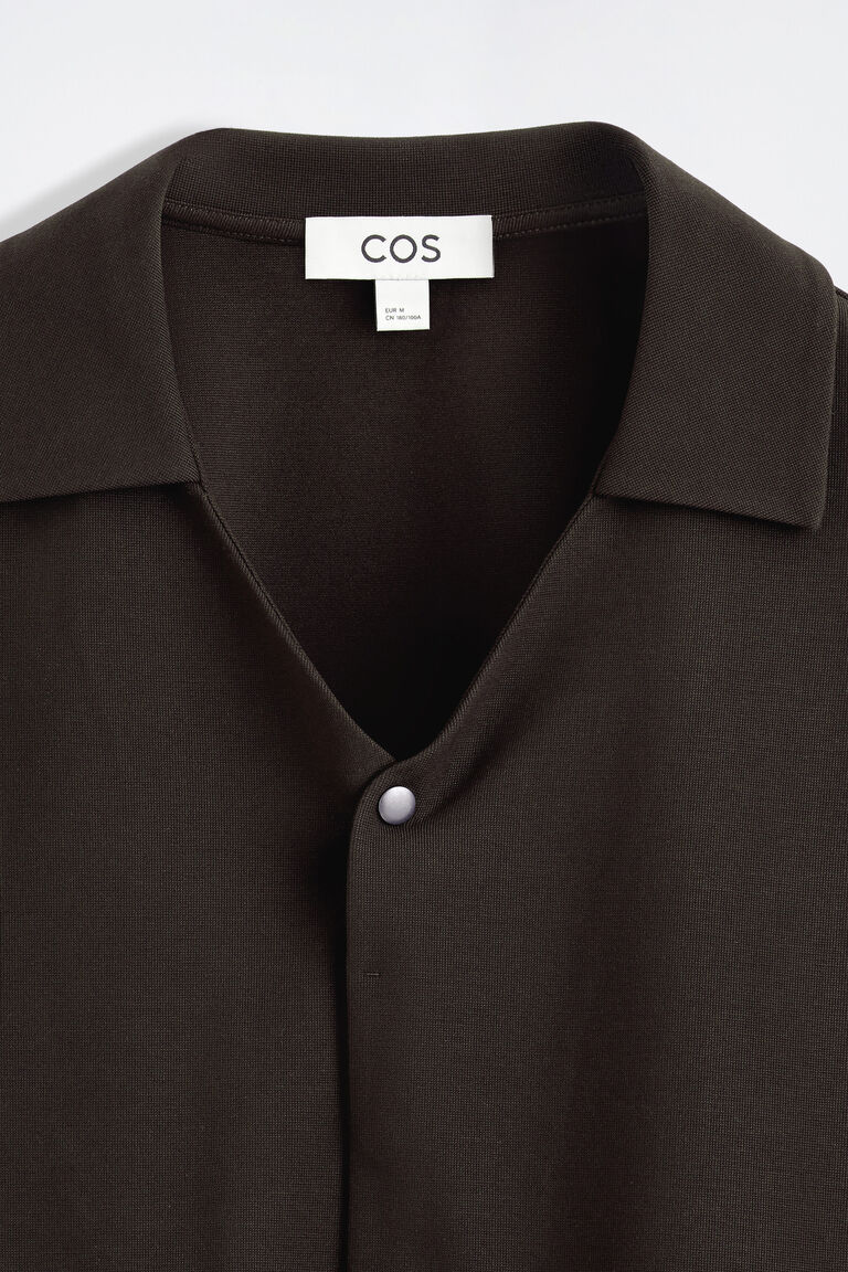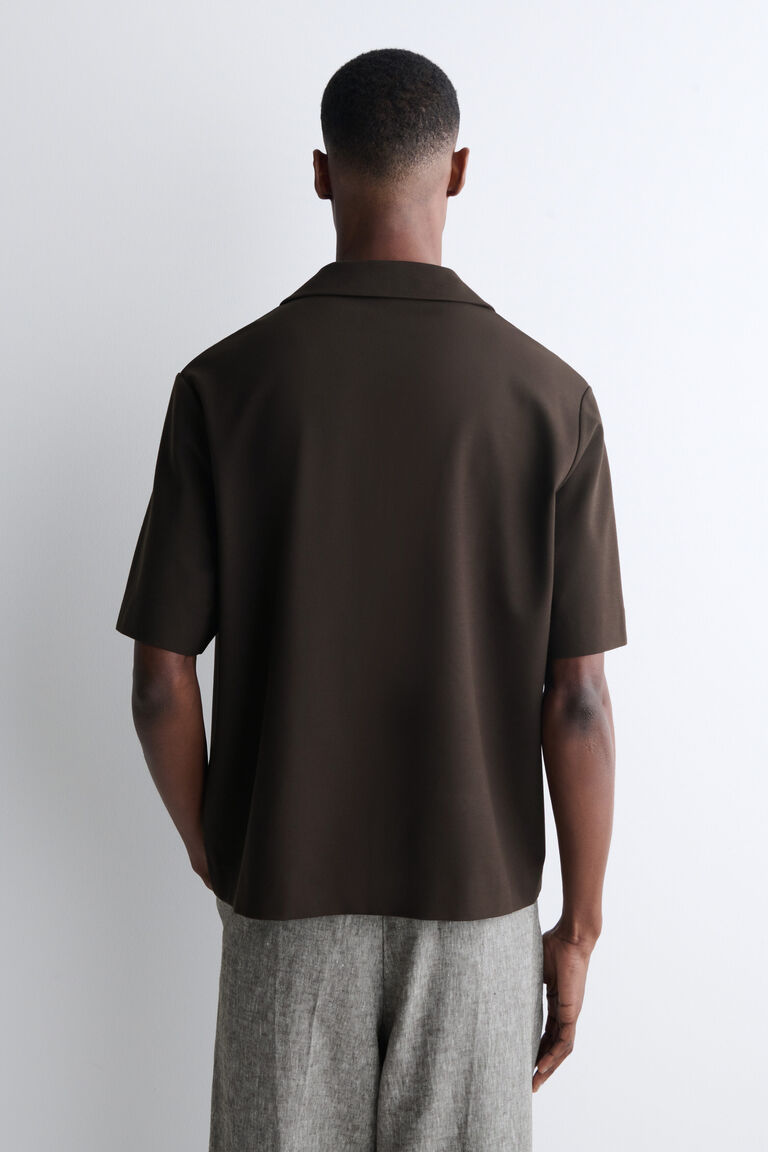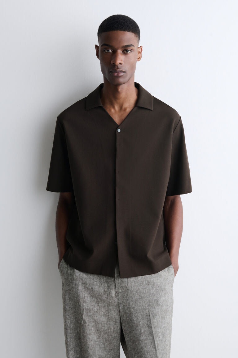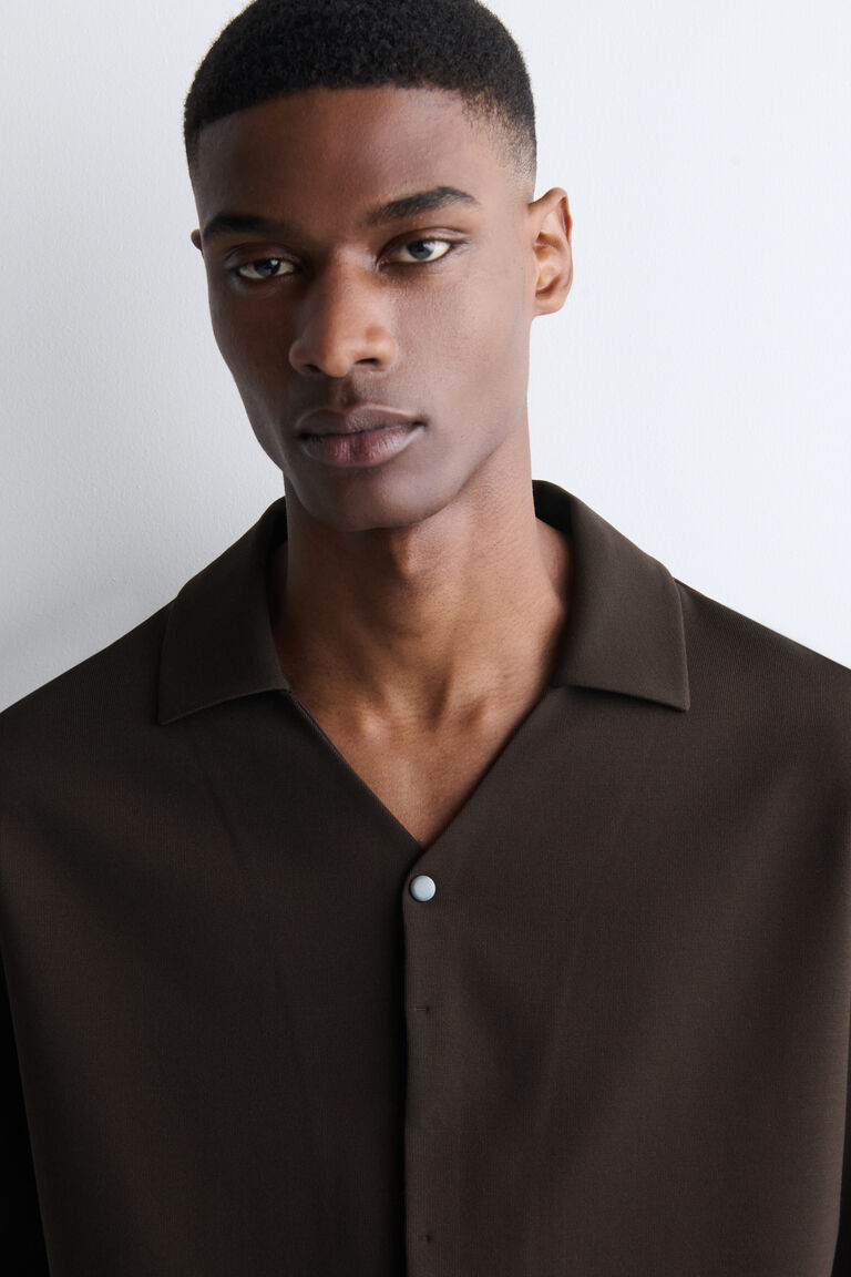 Clean and contemporary, this short-sleeved shirt is crafted from soft Milano-jersey in a bitter chocolate tone. A silver-tone press-stud lends modern appeal, while the open collar and relaxed fit ensure comfort. Style it as a co-ord with the matching shorts.