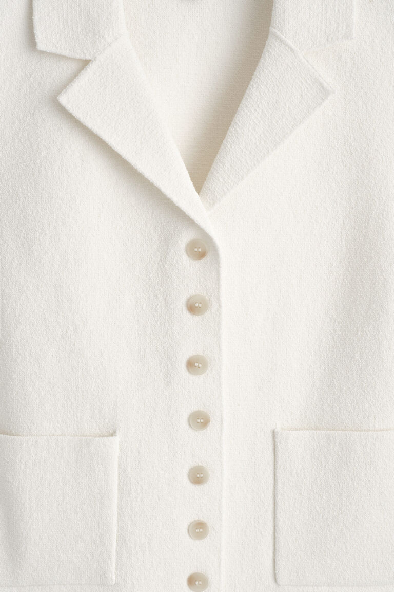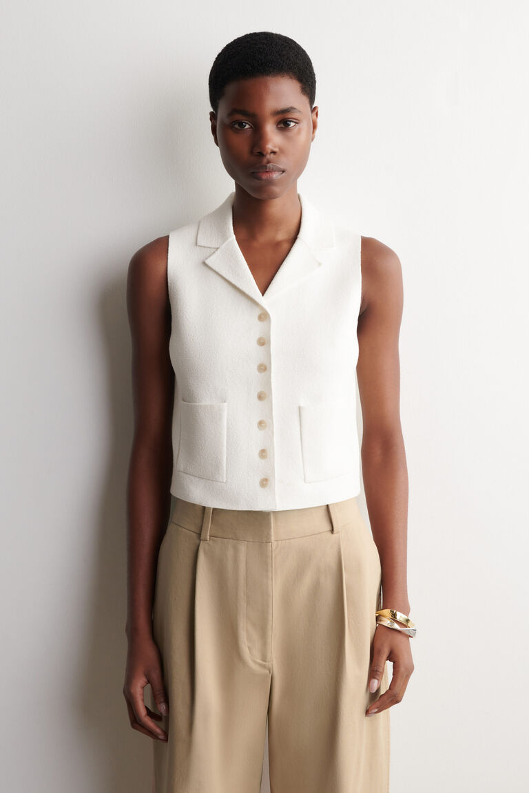 This modern waistcoat softens the codes of classic tailoring. It's bouclé-knitted from a tactile cotton-blend and designed with a resort collar, patch pockets and constrasting buttons. Style it on its own or as a layering piece.