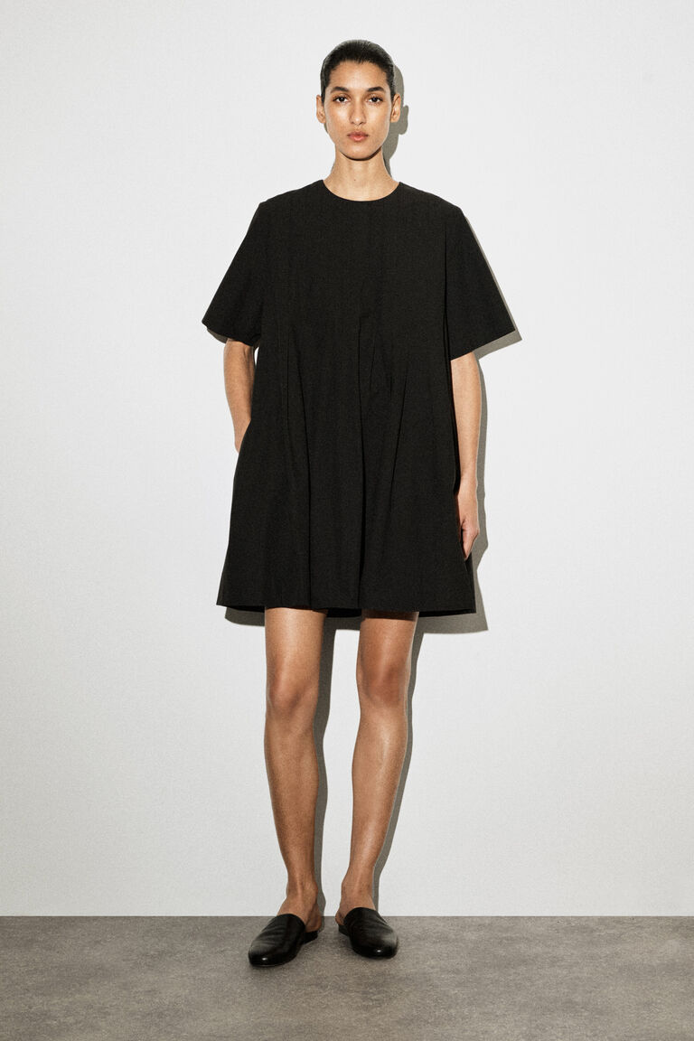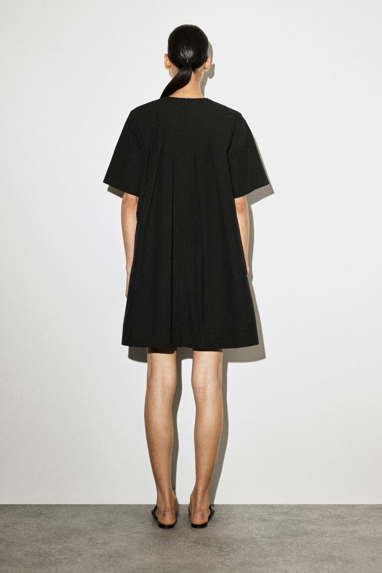 This modern mini dress is an effortless choice for summers in the city. Crafted from crisp cotton-poplin, it's shaped with defined pleats that fall through the body, while the chest pocket, short sleeves and side pockets bring a sense of ease. Style it with leather accessories.