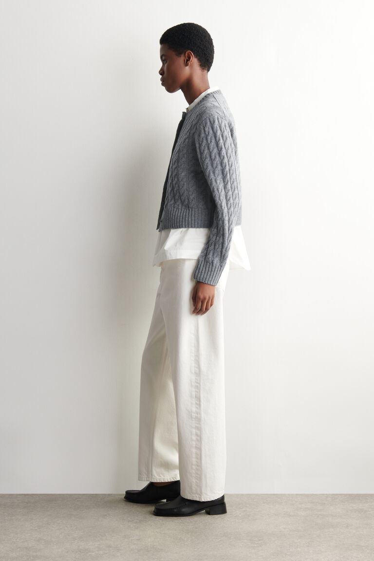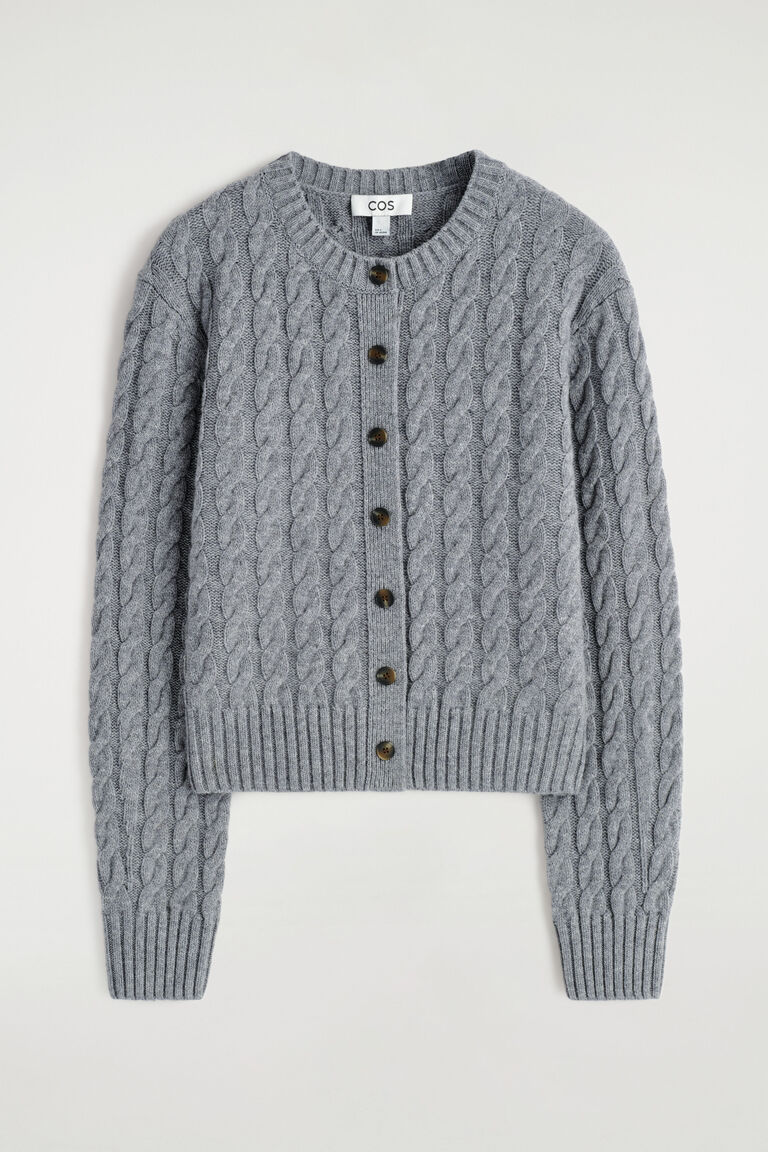 Heritage-inspired knitwear remains a pillar of the COS collection. This cardigan is crafted from 100% merino wool in a tactile cable stitch, with a rounded neckline and ribbed trims for a quietly refined take on a timeless silhouette.
