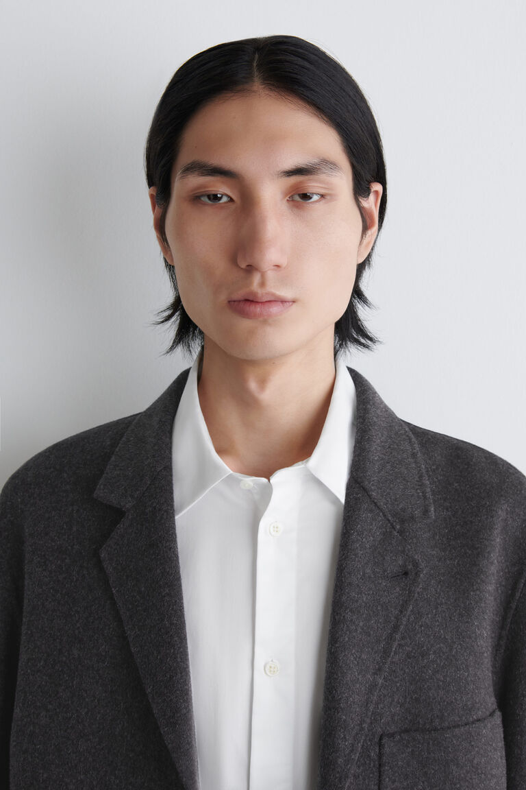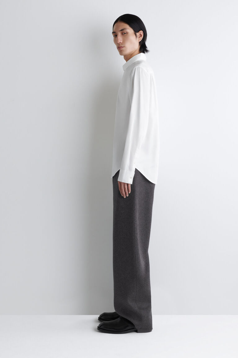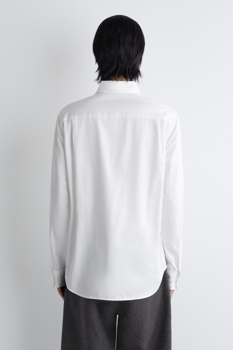 เสื้อเชิ้ตผ้าป็อปลินผ้าฝ้ายออร์แกนิกตัวนี้คลาสสิกเหนือกาลเวลา ออกแบบในทรงเข้ารูปปกติ โดดเด่นด้วยปกเสื้อแบบแหลมคม แขนยาวติดข้อมือ และชายเสื้อด้านหลังโค้งเล็กน้อยที่สามารถสอดในกางเกงขายาวได้อย่างเรียบร้อย กระดุมโทนเดียวกันและการเย็บทับแบบเรียบง่ายช่วยเสริมลุคที่คล่องตัว