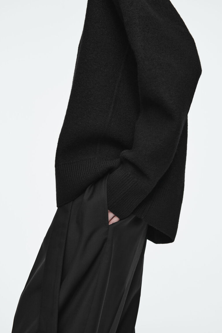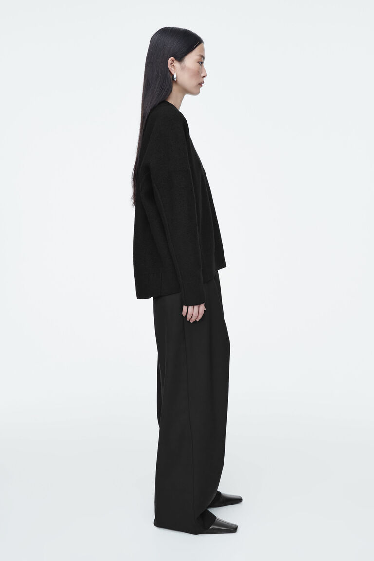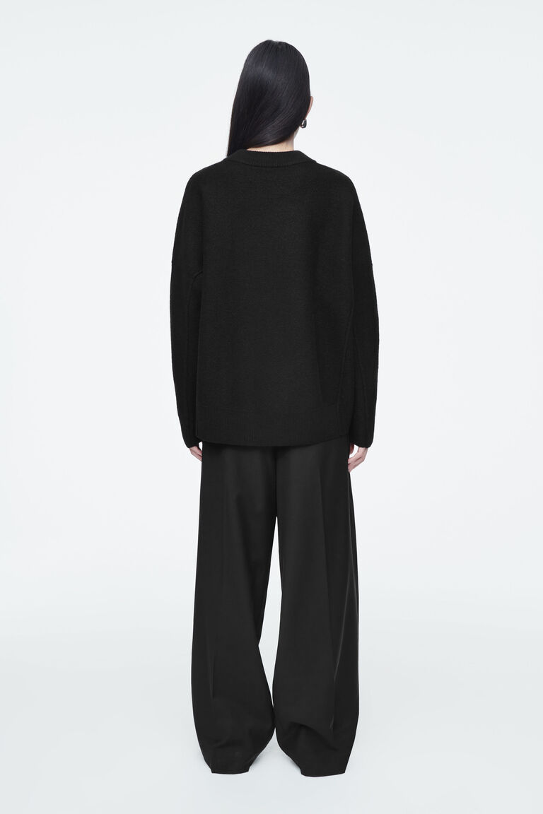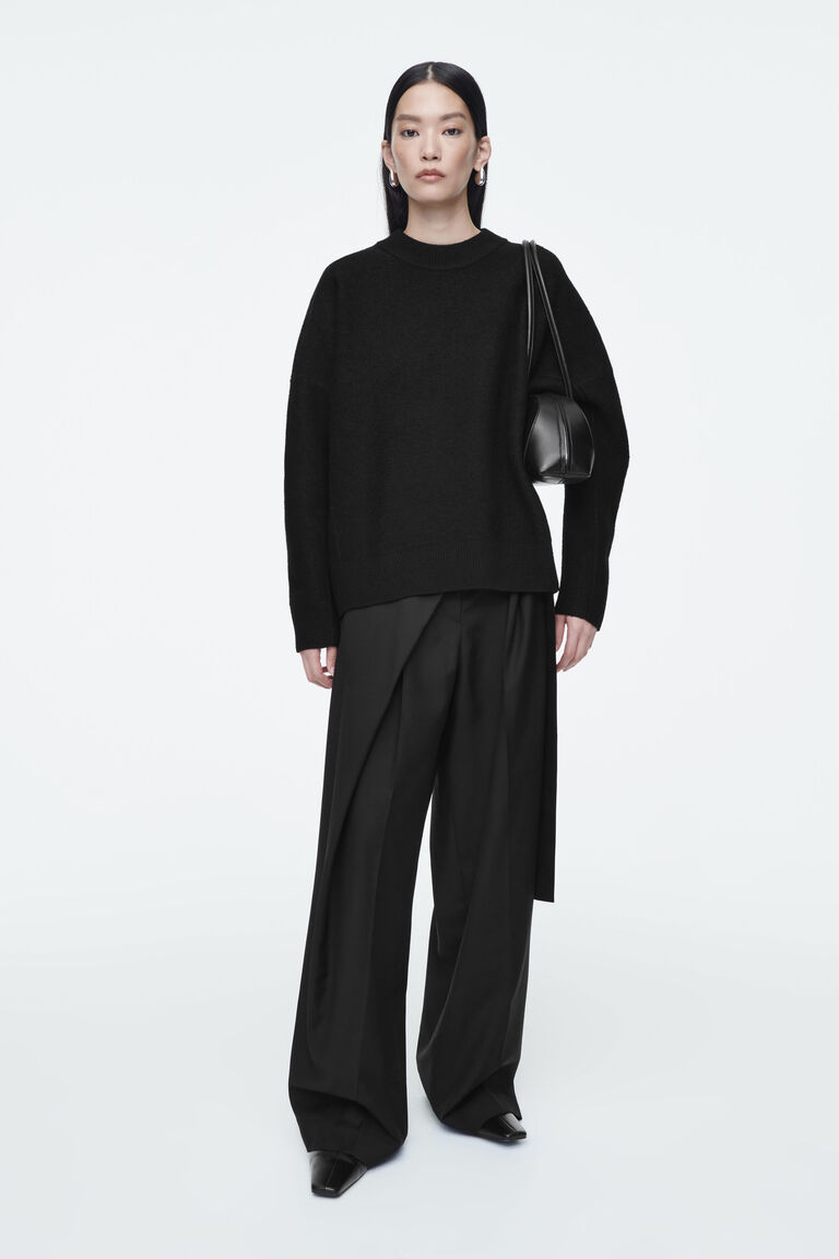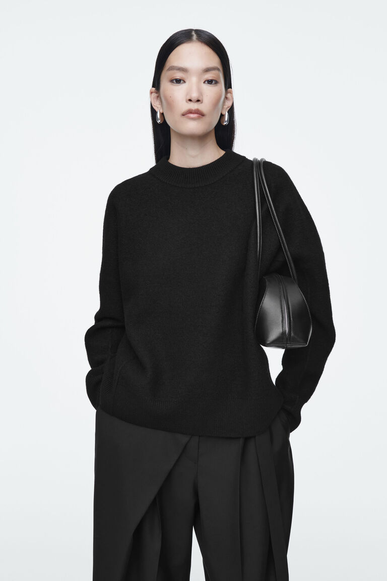 เสื้อสเวตเตอร์สีแดงสดตัวนี้คืออีกหนึ่งวิธีที่สง่างามในการรักษาความอบอุ่นในช่วงเดือนที่อากาศเย็นกว่า ถักทอจากผ้าวูลเมอริโนเนื้อนุ่มพิเศษ ออกแบบในทรงโคคูนที่เสริมด้วยซิลูเอทโค้งมนและไหล่ตก ดีเทลตะเข็บข้างช่วยเสริมโครงสร้างอย่างนุ่มนวล