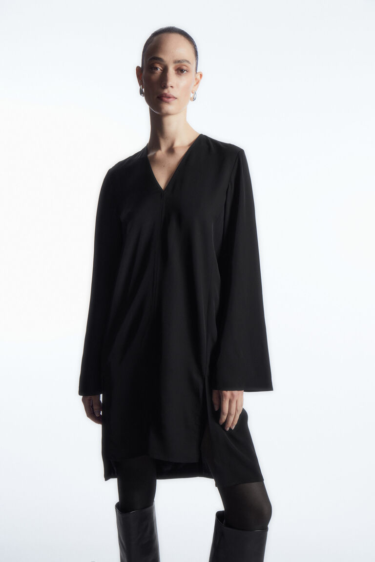 ทีมออกแบบเสื้อผ้าสตรี COS ได้นำเสนอเดรสสีดำคลาสสิกใหม่สำหรับ Autumn Winter 2023 ผลิตจากผ้าวิสโคสเนื้อพลิ้วไหว และออกแบบด้วยคอวีลึก แขนเสื้อพองสวยงาม และผ่าข้างที่สร้างชายเสื้อแบบอสมมาตร สวมใส่กับรองเท้าบูทยาวถึงเข่าเพื่อลุคที่โดดเด่น.