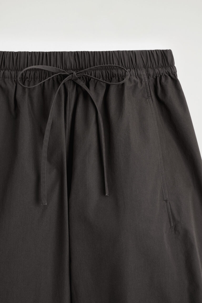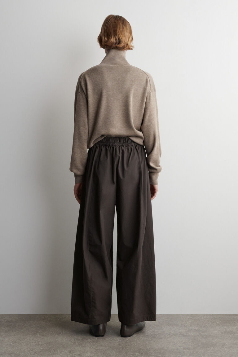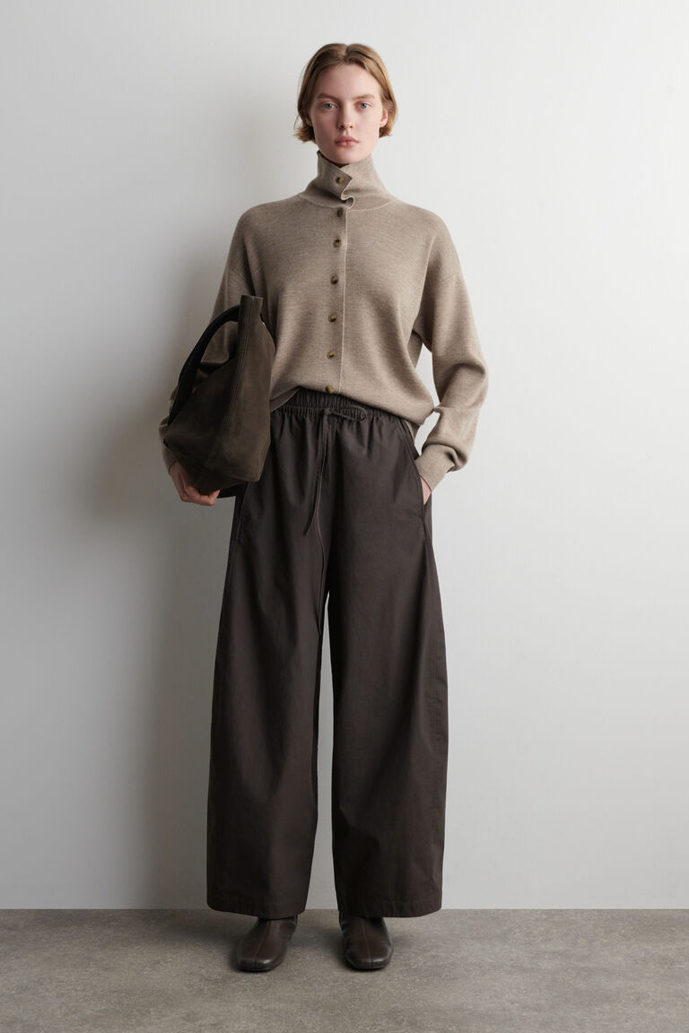 กางเกงสีครีมตัวนี้ ผลิตจากผ้าคอตตอนน้ำหนักเบา ออกแบบในทรงหลวม พร้อมตะเข็บเยื้องศูนย์ที่ช่วยเน้นขากางเกงทรง Barrel ที่พองสวยงาม รายละเอียดการออกแบบ ได้แก่ ขอบเอวยางยืดกว้าง เชือกรูดโทนสีเดียวกัน และกระเป๋าสอดด้านข้างเฉียง.