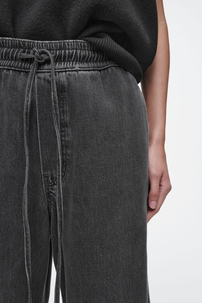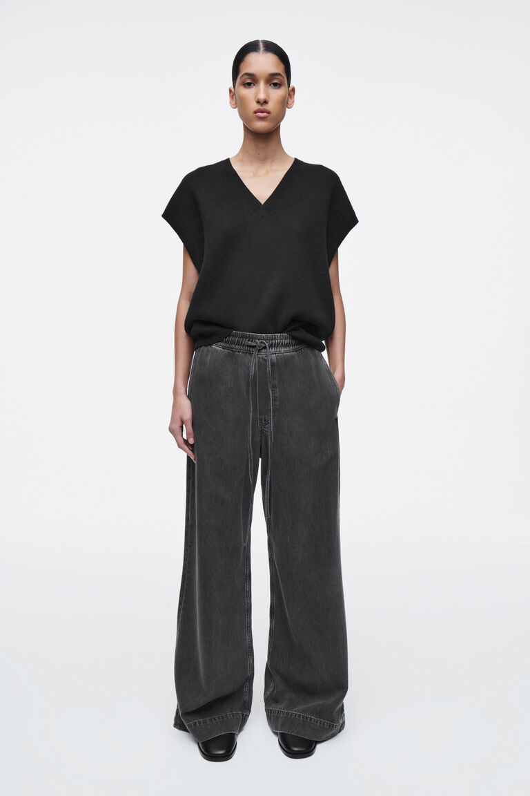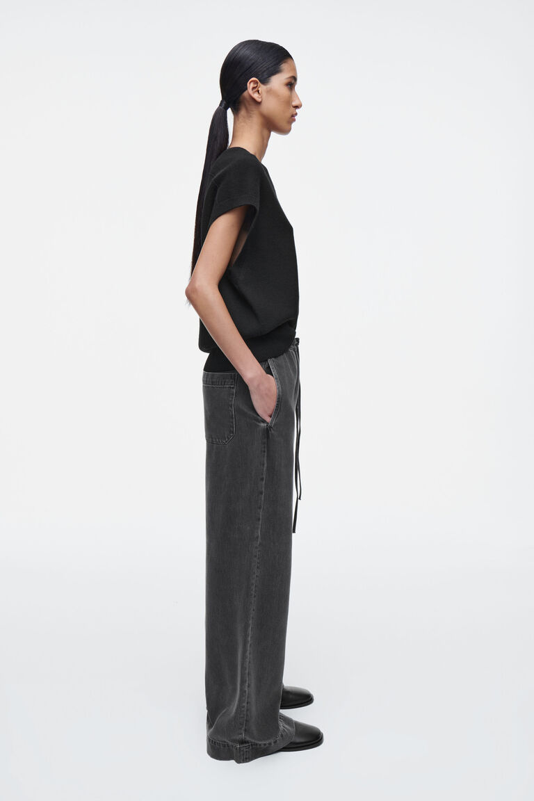 กางเกงเดนิมตัวนี้ ทีมออกแบบเสื้อผ้าสตรี COS ได้นำเสนอในมุมมองใหม่ ด้วยผ้าผสมออร์แกนิกคอตตอนและ TENCEL™ Lyocell เนื้อพลิ้วไหว ออกแบบในทรงขากว้างยาวเต็มตัวที่ได้แรงบันดาลใจจากการตัดเย็บ ในขณะที่ขอบเอวยางยืดและเชือกรูดโทนสีเดียวกันสื่อถึงเสื้อผ้าลำลองที่ได้รับการยกระดับ สีบลูวอชกลางได้รับการจับคู่สีอย่างแม่นยำกับเสื้อที่เข้าชุดกันเพื่อลุคที่ลงตัว.