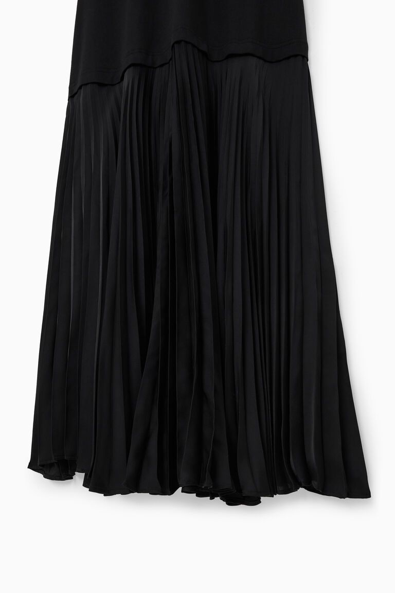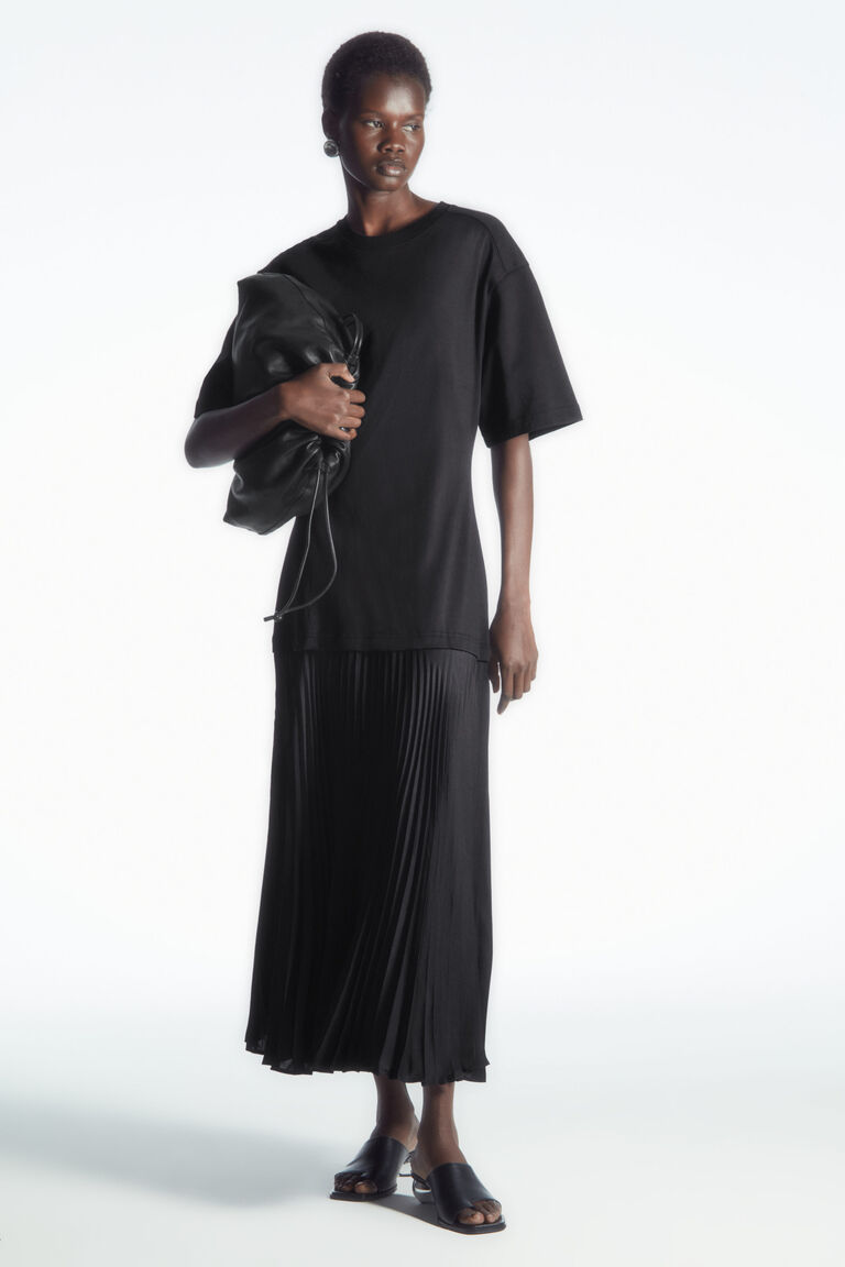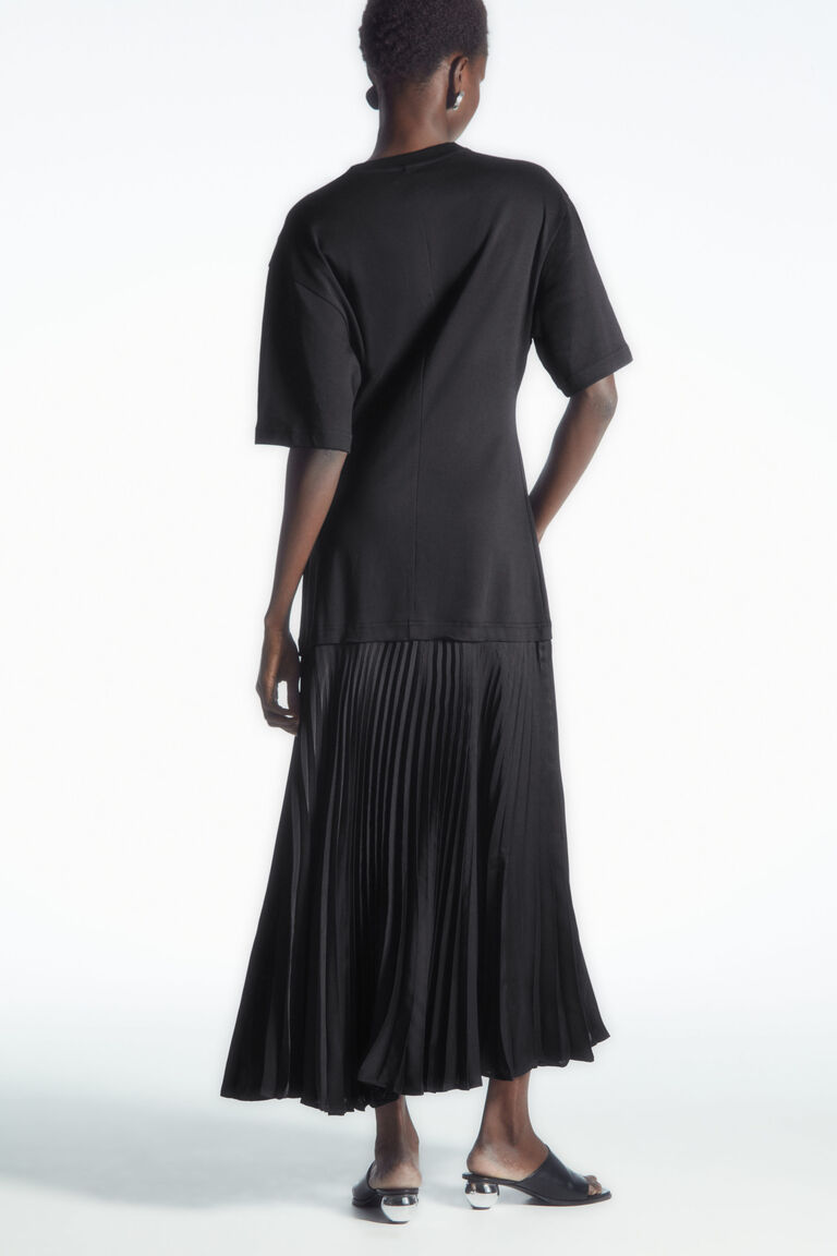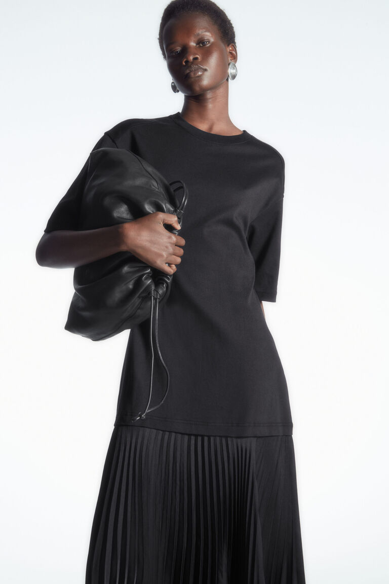 เดรสตัวนี้ ทีมออกแบบเสื้อผ้าสตรี COS ได้นำเสนอใหม่จากเสื้อยืดเดรสคลาสสิกสำหรับฤดูกาลที่จะมาถึง ผลิตจากผ้าคอตตอนบริสุทธิ์ ออกแบบด้วยคอกลม ไหล่ตก และแขนเสื้อครึ่ง ความยาว เอวต่ำช่วยให้ได้ทรงที่พลิ้วไหว ในขณะที่กระโปรงผ้าซาตินจับพลีทแบบ Sunray ช่วยเพิ่มความพลิ้วไหว.