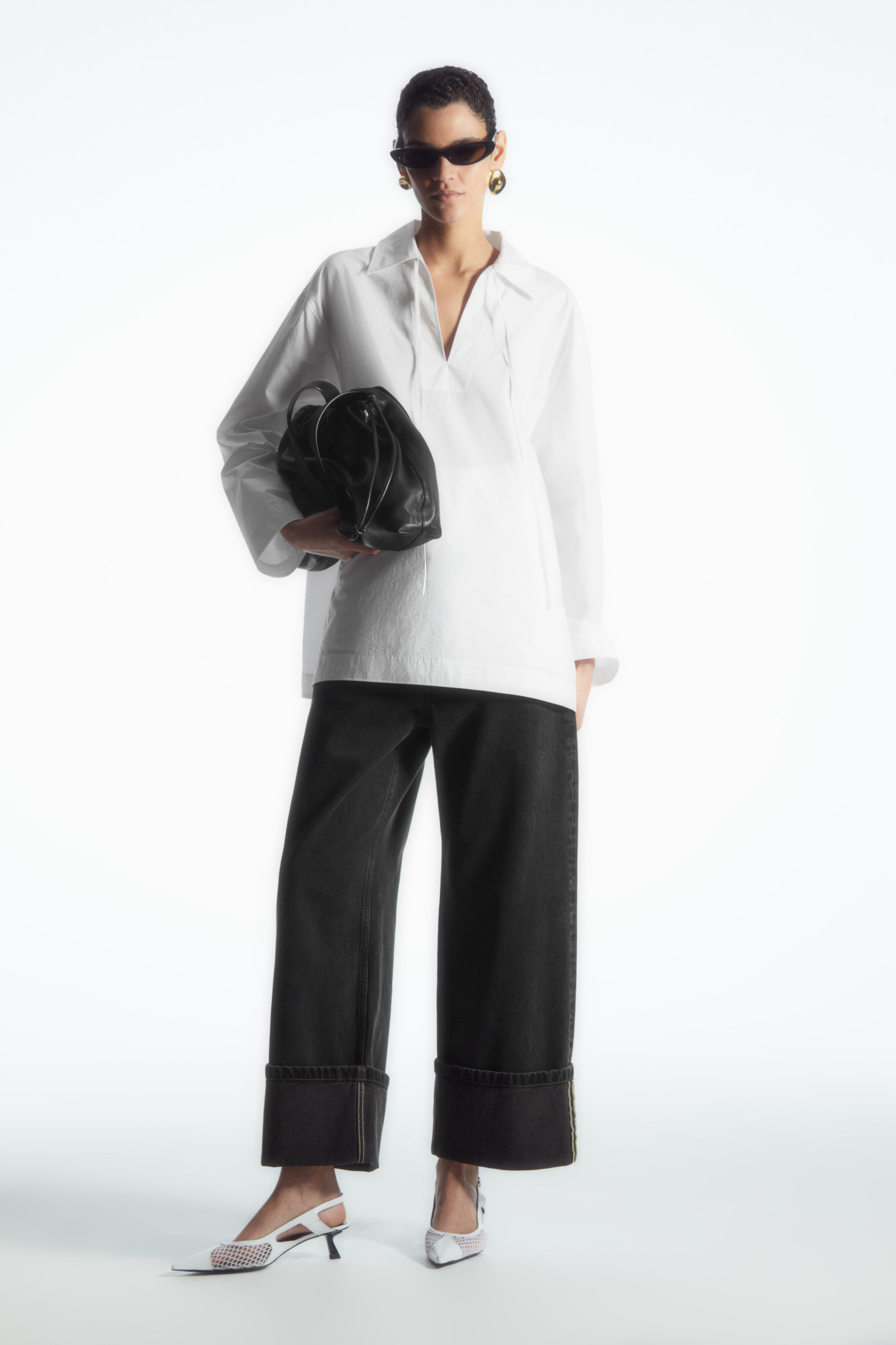เสื้อเบลาส์ร่วมสมัยตัวนี้ ผลิตจากผ้าคอตตอนเนื้อนุ่ม โดดเด่นด้วยคอวีลึกและสายผูกโทนสีเดียวกันที่สง่างาม ออกแบบด้วยปกเสื้อปลายแหลมเรียบร้อย กระเป๋าเจาะเฉียง และจีบด้านหลังที่ช่วยเพิ่มวอลลุ่มให้กับทรง Relaxed.