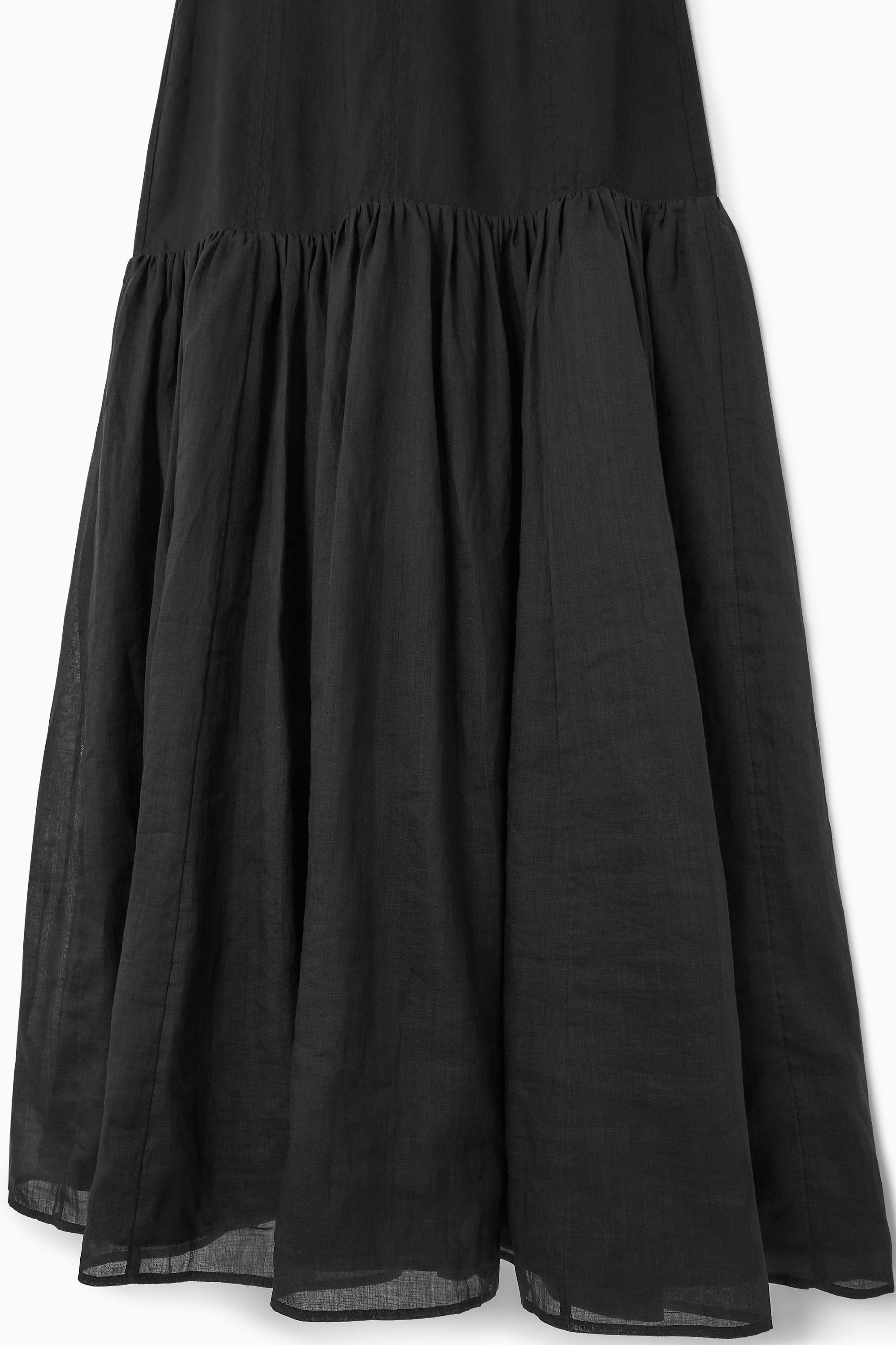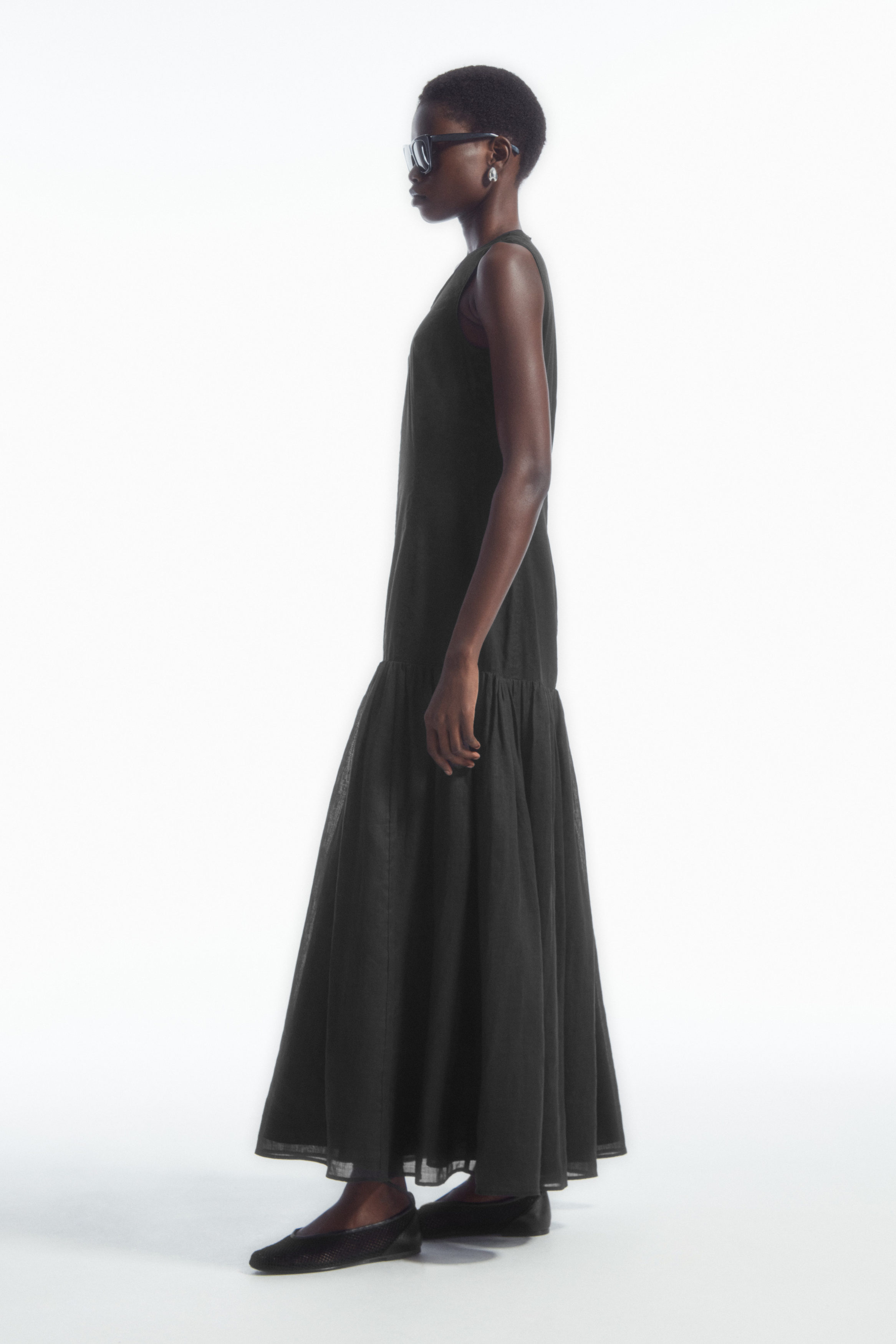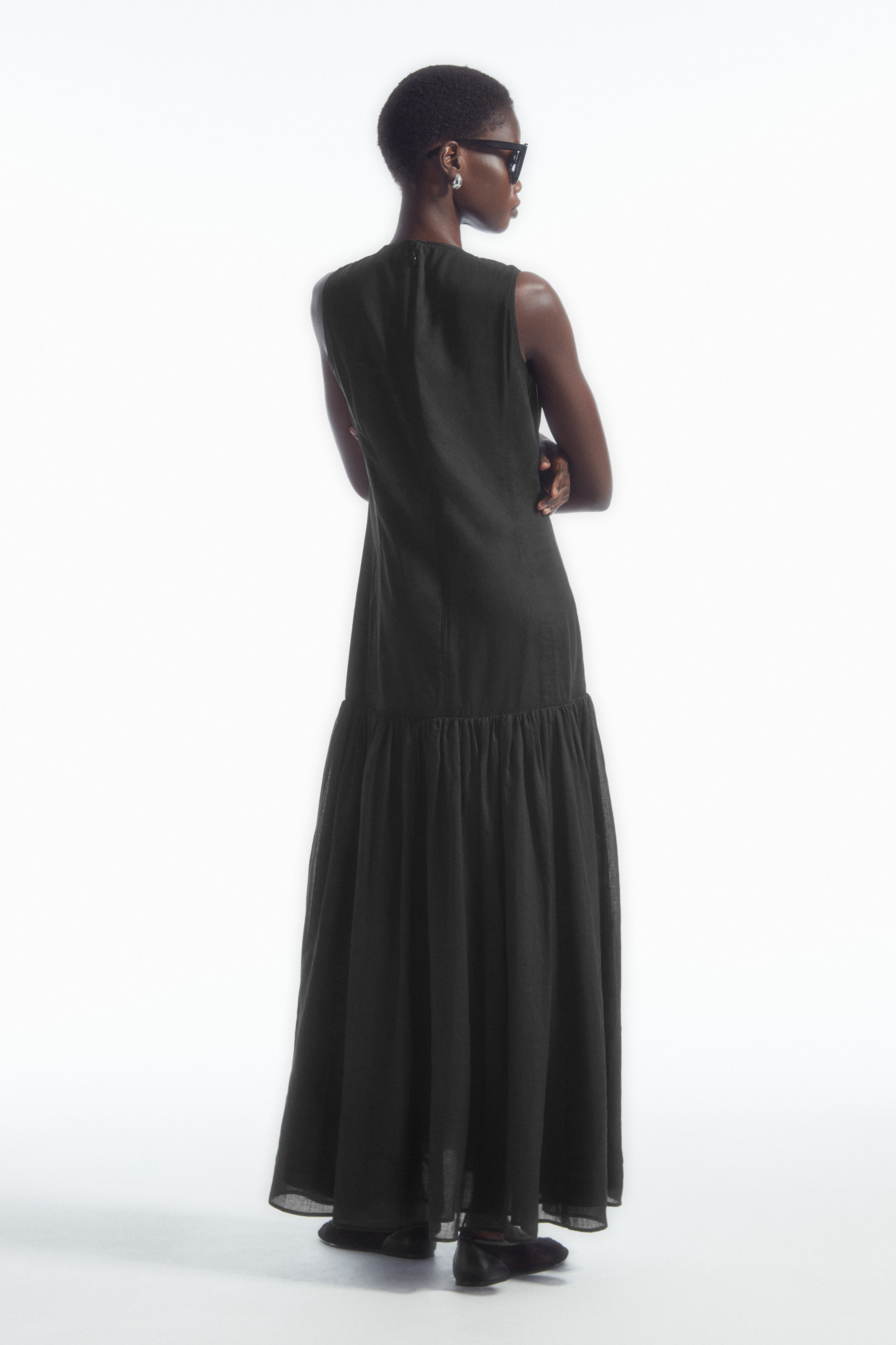 เดรสยาวแม็กซี่ตัวนี้ โดดเด่นด้วยเนื้อผ้าที่ตัดกันสองชนิด – เสื้อท่อนบนผลิตจากผ้าลินินผสมน้ำหนักเบา ในขณะที่กระโปรงผลิตจากผ้า Ramie เนื้อพลิ้วไหว ออกแบบเอวต่ำตามสไตล์ยุค 2000 พร้อมจับรูดเบาๆ ที่ชายกระโปรงเพื่อเพิ่มความพลิ้วไหว.