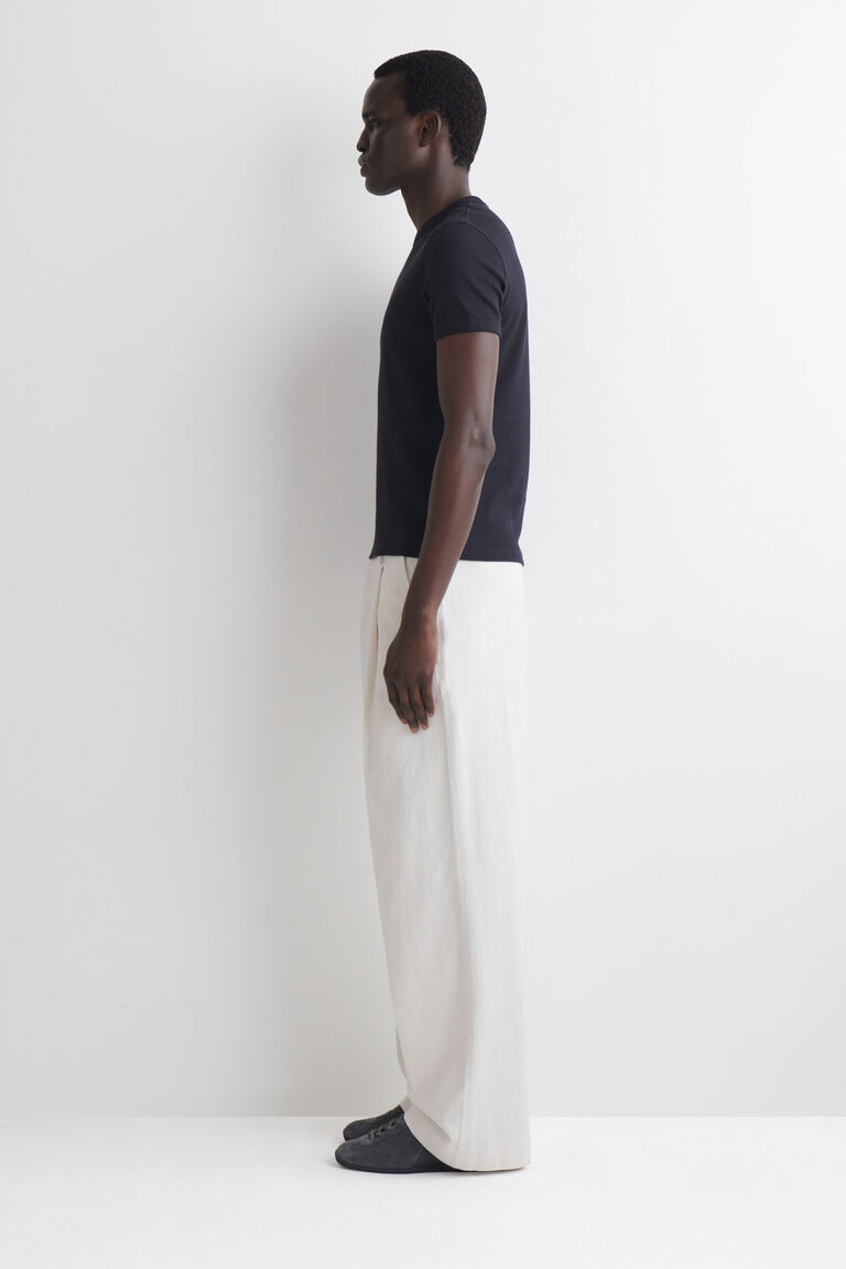 เสื้อยืดตัวนี้ ทีมออกแบบเสื้อผ้าบุรุษ COS ได้นำเสนอใหม่จากเสื้อยืดทรงสลิมสำหรับคอลเลกชั่นนี้ ผลิตจากผ้าเจอร์ซีย์ผสมออร์แกนิกและรีไซเคิลคอตตอนพร้อมส่วนผสมของผ้ายืดเล็กน้อย ถักทอแบบริบละเอียดเพื่อให้เข้ารูปช่วงอกและแขนเสื้อ ทรงสลิมจะช่วยเสริมลุคให้ดูดีเมื่อสวมใส่กับเสื้อเชิ้ตหรือเสื้อเบลเซอร์โอเวอร์ไซส์.