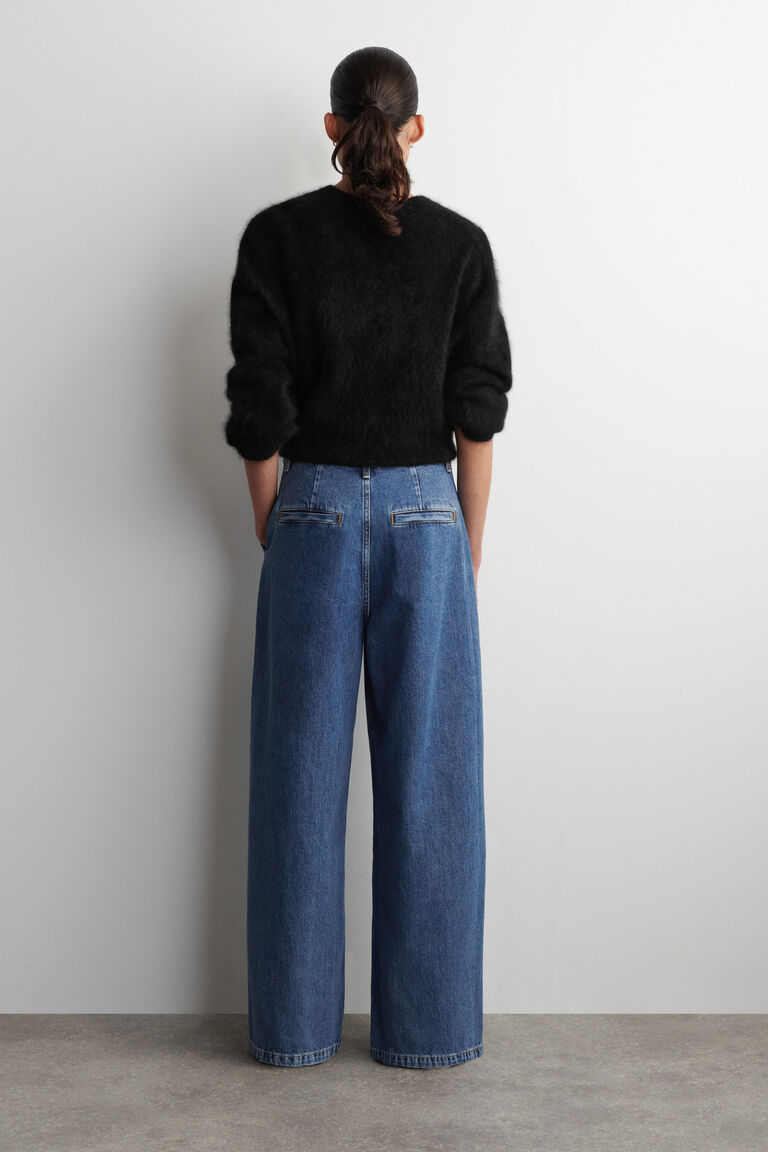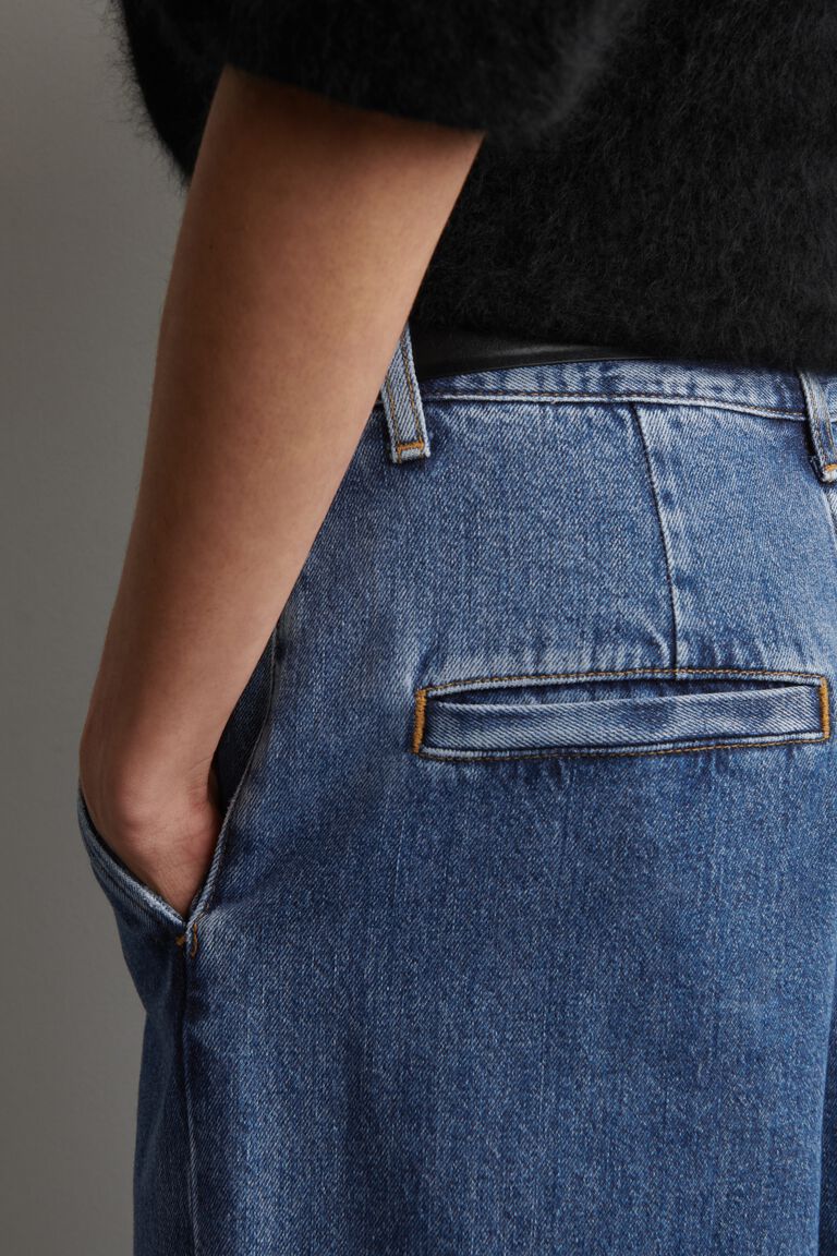 กางเกงขายาวตัวนี้ ผลิตจากผ้ายีนส์ดิบ ออกแบบเอวสูงและขากว้างที่ทิ้งตัวสวยงามเหนือรองเท้า สีกรมท่าเข้มตัดกับตะเข็บสีน้ำตาลเข้ม ในขณะที่ห่วงเข็มขัดที่กว้างขึ้นและดีไซน์สี่กระเป๋าช่วยให้ลุคเดนิมคลาสสิกดูทันสมัย สวมใส่กับเสื้อแจ็กเก็ตที่เข้าชุดกันเพื่อลุคที่ลงตัว.