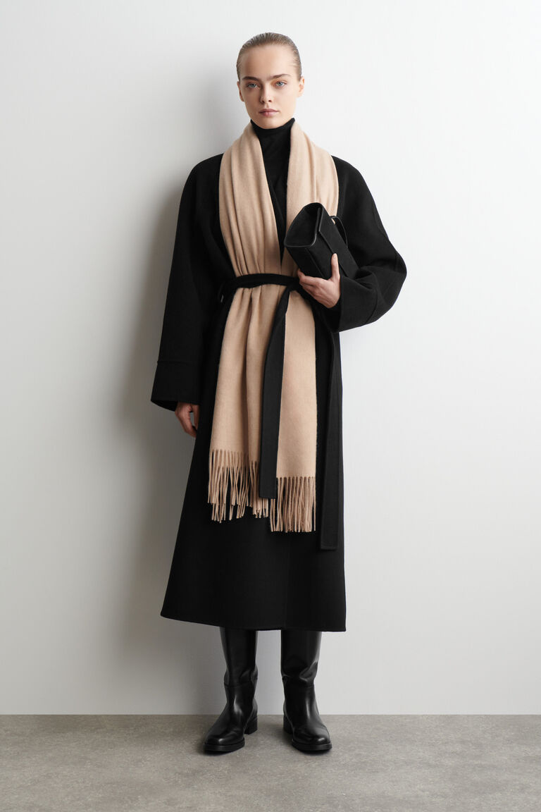 เครื่องประดับที่ได้รับการคัดสรรอย่างพิถีพิถันช่วยเพิ่มสัมผัสและความประณีตให้กับตู้เสื้อผ้าฤดูใบไม้ร่วง/ฤดูหนาว ผ้าพันคอสีบอร์โดซ์นี้ตัดเย็บในทรงกว้าง ผลิตจากขนแกะ RWS ผสมกับผ้าคาชเมียร์มาตรฐาน Good Cashmere Standard® เพื่อเพิ่มความอบอุ่นและสัมผัสที่หรูหรา ตกแต่งด้วยขอบพู่ที่ปลายทั้งสองด้าน