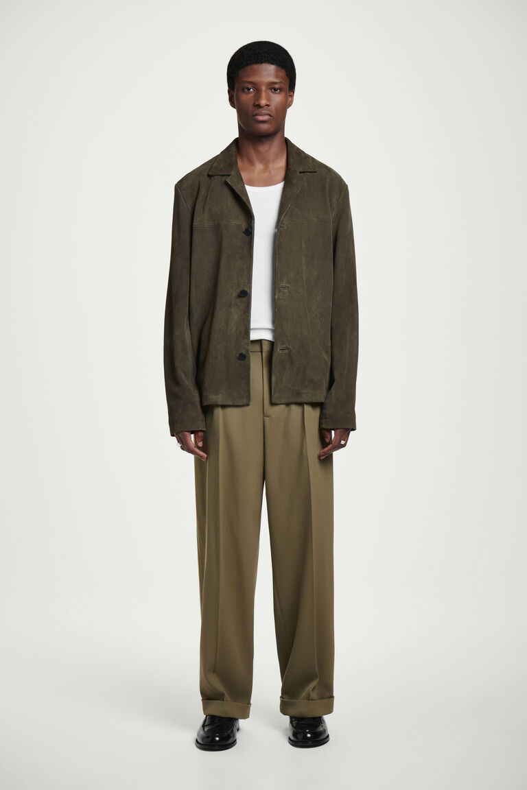 กางเกงขายาวทรงทันสมัยตัวนี้เป็นการนำเสนอเสื้อผ้าแนวเทเลอร์ในสไตล์ที่ผ่อนคลาย ผลิตจากผ้าทวิลผสมผ้าวูล ตัดเย็บในทรงขากว้างตรงสบายๆ พร้อมชายขากางเกงแบบพับ ออกแบบมาพร้อมขอบเอวเรียบร้อย จีบด้านหน้า และแถบปรับด้านในเพื่อให้ได้ทรงที่พอดีตัว