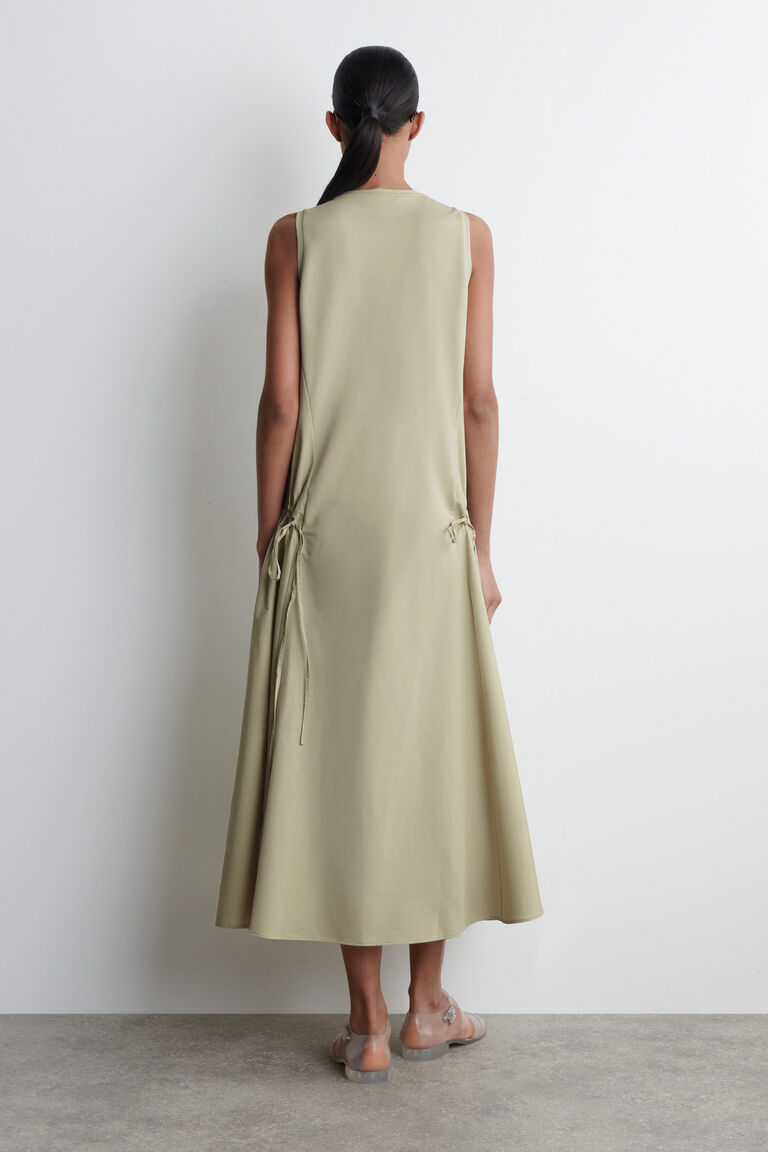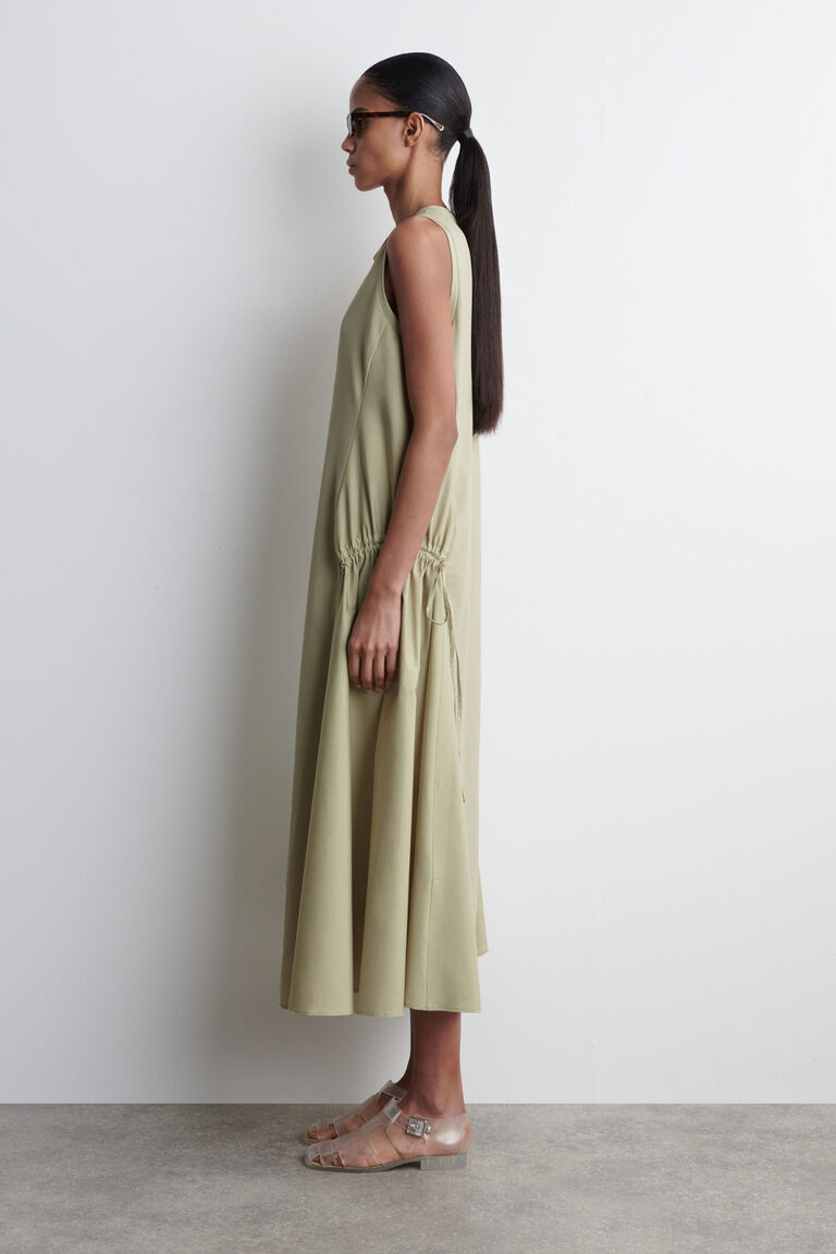 เดรสยาวมิดี้ทรงทันสมัยตัวนี้เล่นกับเท็กซ์เจอร์ของผ้า โดยมีเสื้อท่อนบนผ้าเจอร์ซีย์ผ้าฝ้าย และแผงผ้าป็อปลินจับรูดที่ด้านข้างทั้งสองฝั่ง เหมาะสำหรับอากาศอบอุ่น ตัดเย็บในดีไซน์แขนกุดเรียบง่าย และทรงพองหลวมสบาย