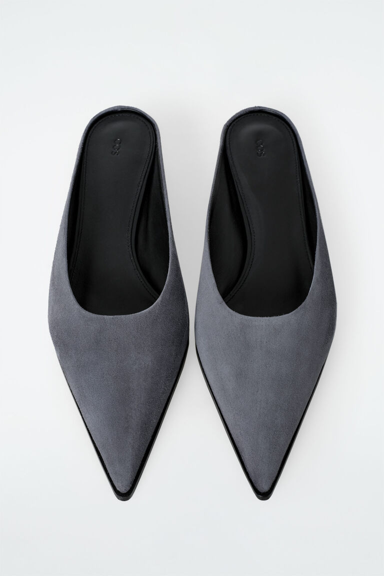 คอลเลคชั่นเสื้อผ้าสตรี SS25 จาก COS ยังคงสานต่อหลักการสำคัญของแบรนด์ในการสร้างสรรค์ดีไซน์ที่ยั่งยืนและงานฝีมืออันประณีตบรรจง รองเท้า뮬ส์ทรงสง่างามคู่นี้ได้รับการออกแบบด้วยหัวรองเท้าปลายแหลมอันโดดเด่น และส้นเตารีดขนาดพอเหมาะที่ช่วยเสริมให้ดูสูงขึ้น ผลิตจากหนังกลับฟอกโครเมียมฟรีที่มีผิวสัมผัสหรูหราในโทนสีแอนทราไซต์เหนือกาลเวลา พร้อมพื้นรองเท้าด้านในและพื้นรองเท้าด้านนอกทำจากหนังเนื้อนุ่มราวเนย มอบความสบายในการสวมใส่