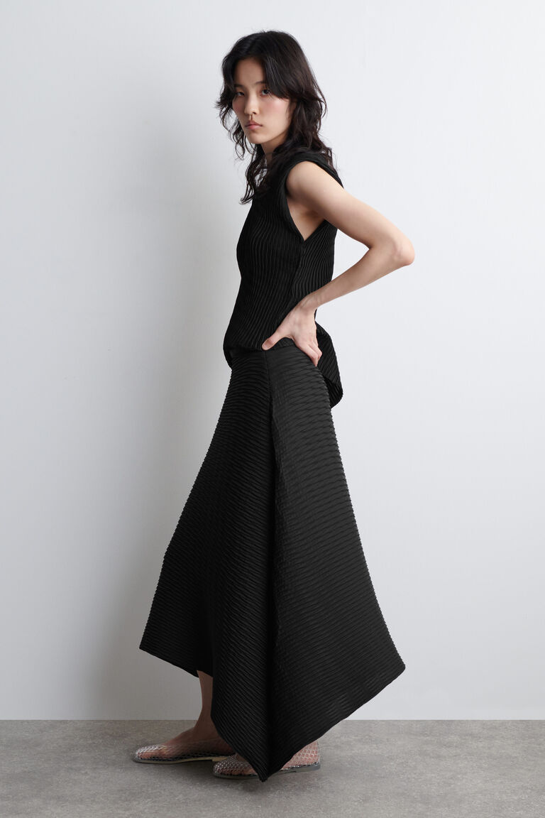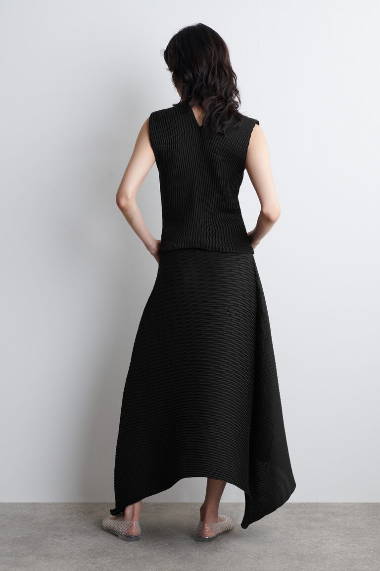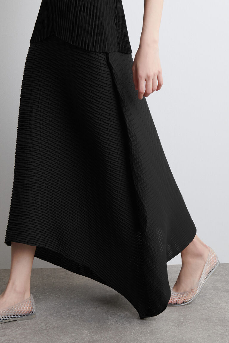 กระโปรงมิดี้ทรงสวยที่มีเส้นสายโครงสร้างโดดเด่นและเคลื่อนไหวอย่างมีชีวิตชีวา ผลิตจากผ้าทรงโครงสร้างที่ยืดหยุ่นพร้อมรอยพับลอนคลื่นทั่วทั้งผืนผ้า เพิ่มความน่าสนใจให้กับพื้นผิว ขอบกระโปรงโค้งได้รับการเย็บขอบอย่างประณีตเพื่อความเรียบร้อย สไตล์เข้าคู่กับ เสื้อท่อนบนที่เข้าชุดกัน.